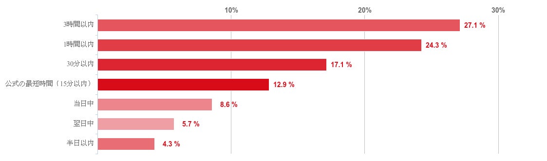 SMBCモビットの審査結果が通知されるまでの時間は、「3時間以内」が最も多く27.1%、続いて「1時間以内」が24.3%、「30分以内」が17.1%となった。