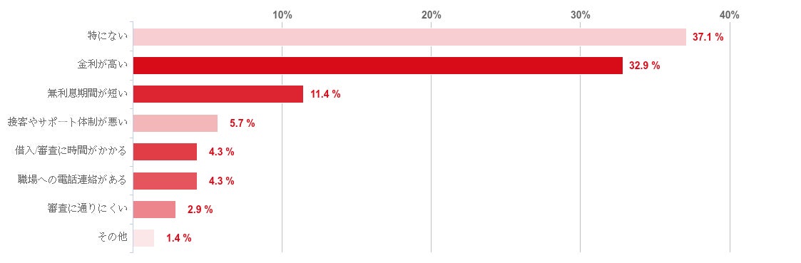 一方、SMBCモビットの改善点には、「特にない」と答えた人が37.1%で最も多かったが、「金利が高い」との回答も32.9%集まった。また、「無利息期間が短い」が11.4%でこれに続いた。