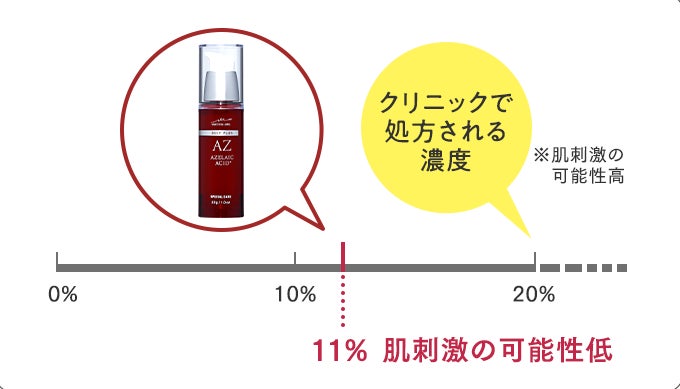 配合している純アゼライン酸は11%と高濃度であり、誘導体に比べ分子量が小さく、より早く浸透し、より早く効果を発揮することが可能です。