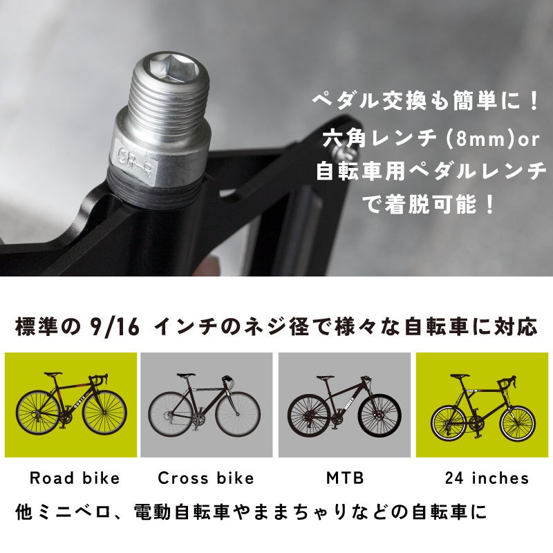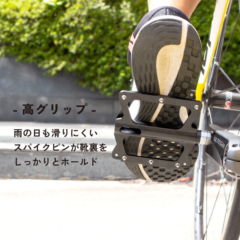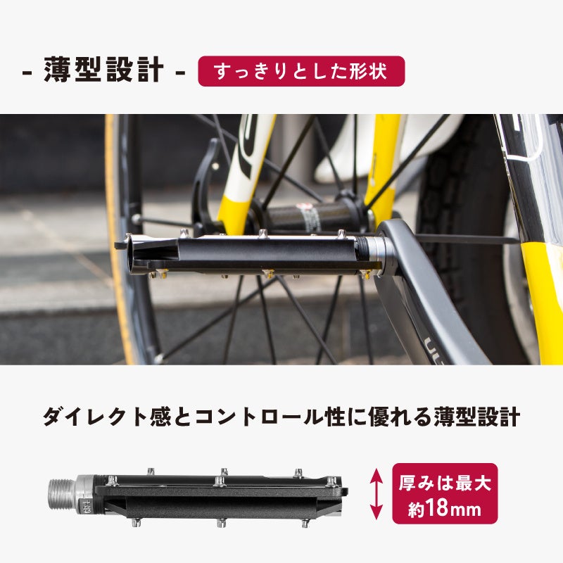 幅広で軽量、靴との接触部分が大きく、少ない力で効率の良いペダリングが可能なペダルです。ブラックベースでシンプルな2トーンカラーは街乗りらしい都会的デザインです。