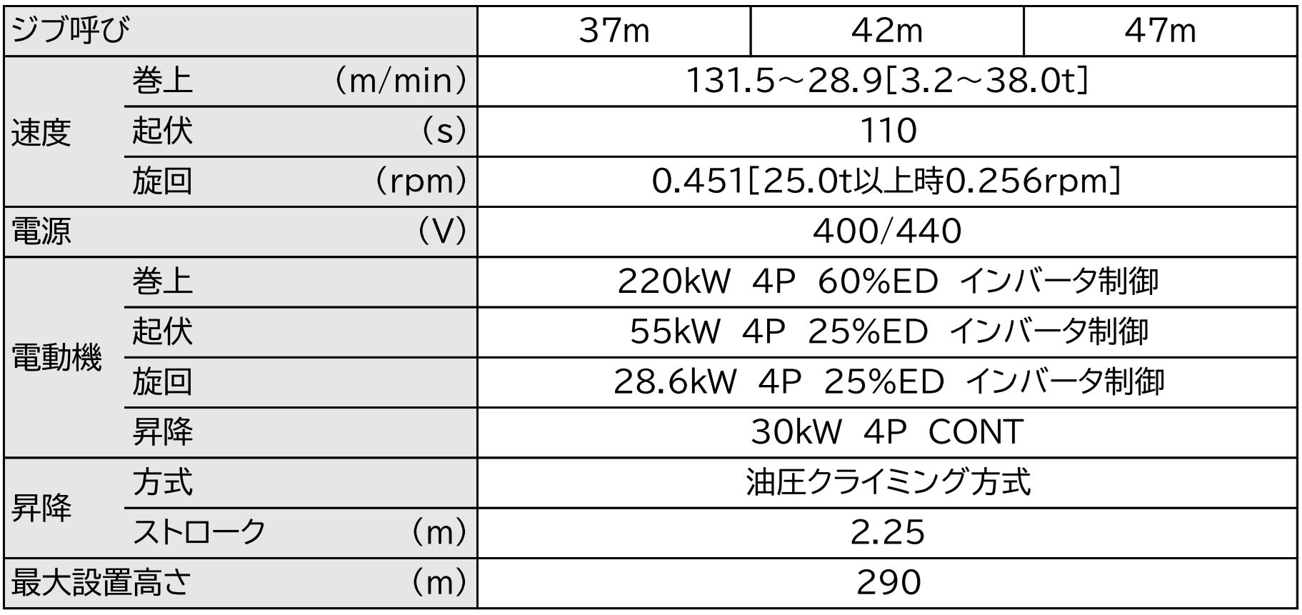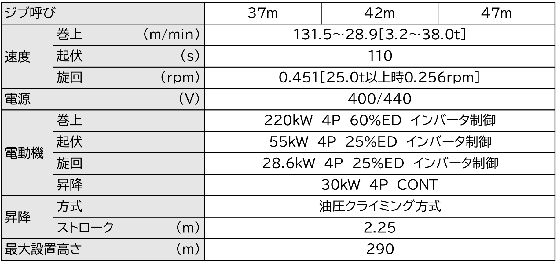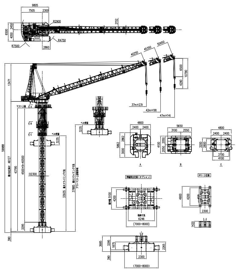 ⑧ジブは37m・42m・47mの3段階で調節可能