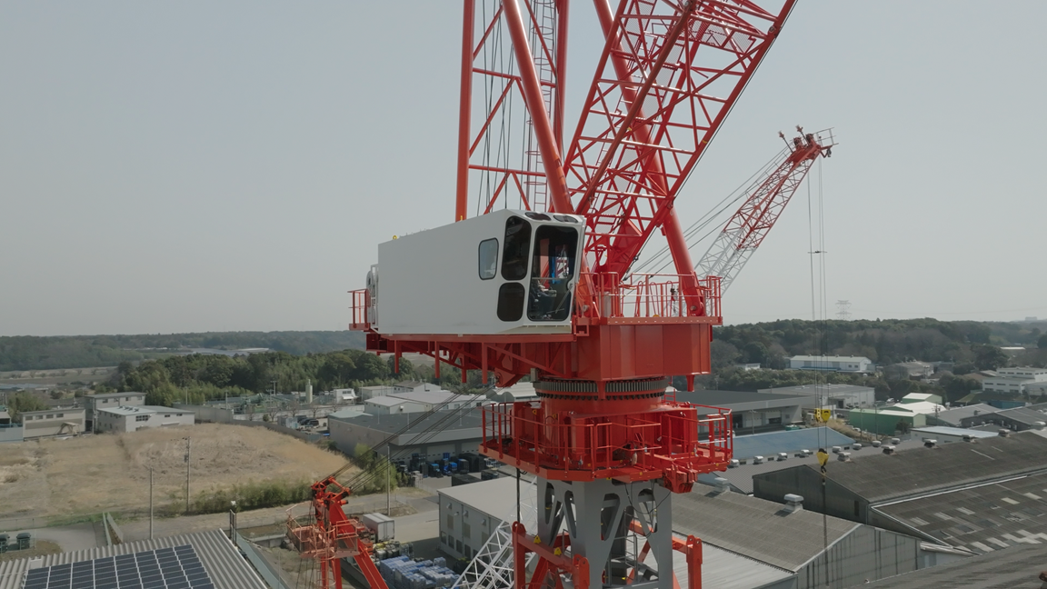 クライミング作業では、まず天秤を取り付けたタワーをクレーン自体で吊り上げて待機させます。続いて、昇降体の引き込みトロリに掛け替え、トロリで支えながら、横行装置を操作してタワーを引き込みます。1本あたりの作業時間は約2時間と短く、従来のフロアクライミング方式では2日かかっていた作業を1日で完了でき、大幅な時間短縮を可能にしました。また、上面にタワー取り込み口が不要になったことで、旋回体の構造をコンパクトにできるため、1,000t・m級クレーンでありながら、600t・m級クラスの旋回体サイズを実現しました。旋回体の後部が短いため、敷地外への越境や周囲への干渉リスクも低減します。さらに、クライミング時に使用するアウトマスト上部は脱着式で、取り外すことで最上階でのクライミング作業に必要な台座引き上げの伸びしろが確保できます。クレーン本体とクライミング装置が独立して動く構造により、上昇作業後すぐにクレーンを使用できるのも大きな利点です。また、作業中もジブ方向を360度回転させることができ、ジブの長さも37m・42m・47mの3段階で調節が可能です。建設現場において、作業効率と安全性が大幅に向上し、超高層建築における施工の可能性をさらに広げます。