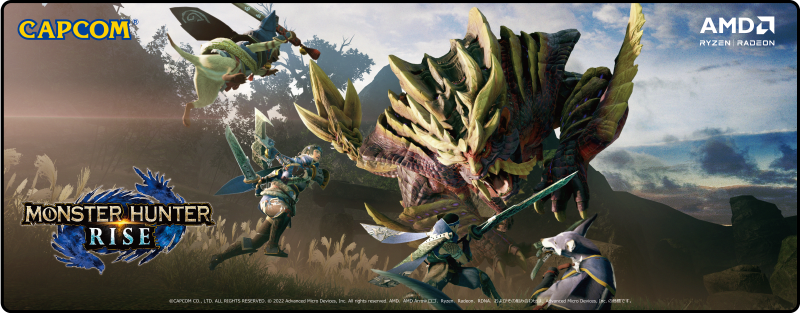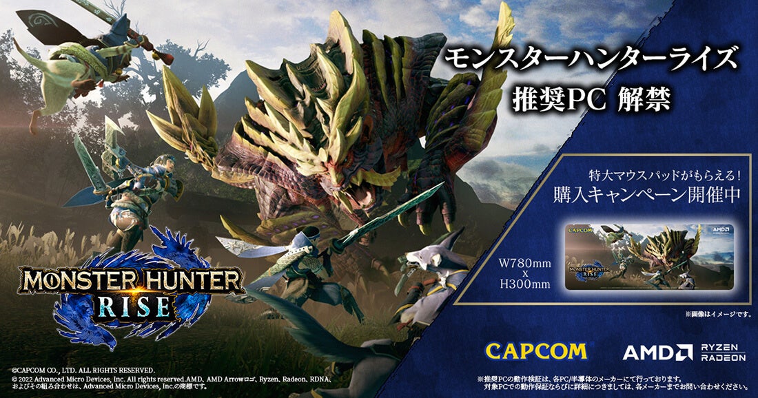 また、購入特典として「モンスターハンターライズ 推奨PC」をご購入の方に、横780mm×縦300mmのオリジナル特大マウスパッドをプレゼントいたします(※プレゼントは先着順となり、無くなり次第終了となります)。