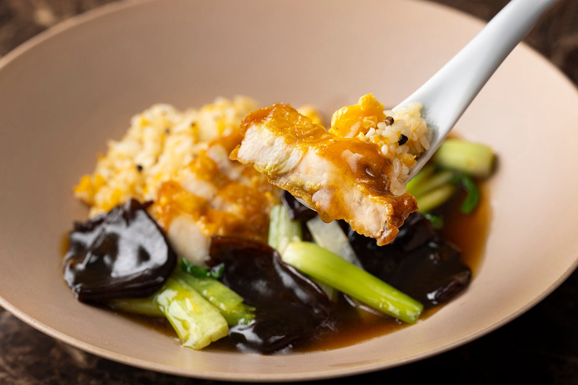 宮城県が誇る希少なブランド豚「伊達の純粋赤豚」を主役に、生きくらげの弾力ある食感を加えたパイコー炒飯。パラパラとした炒飯に、繊細な甘さのジューシーな豚肉のコクと香ばしさが移り、濃厚な味わいへと進化した珠玉の逸品。