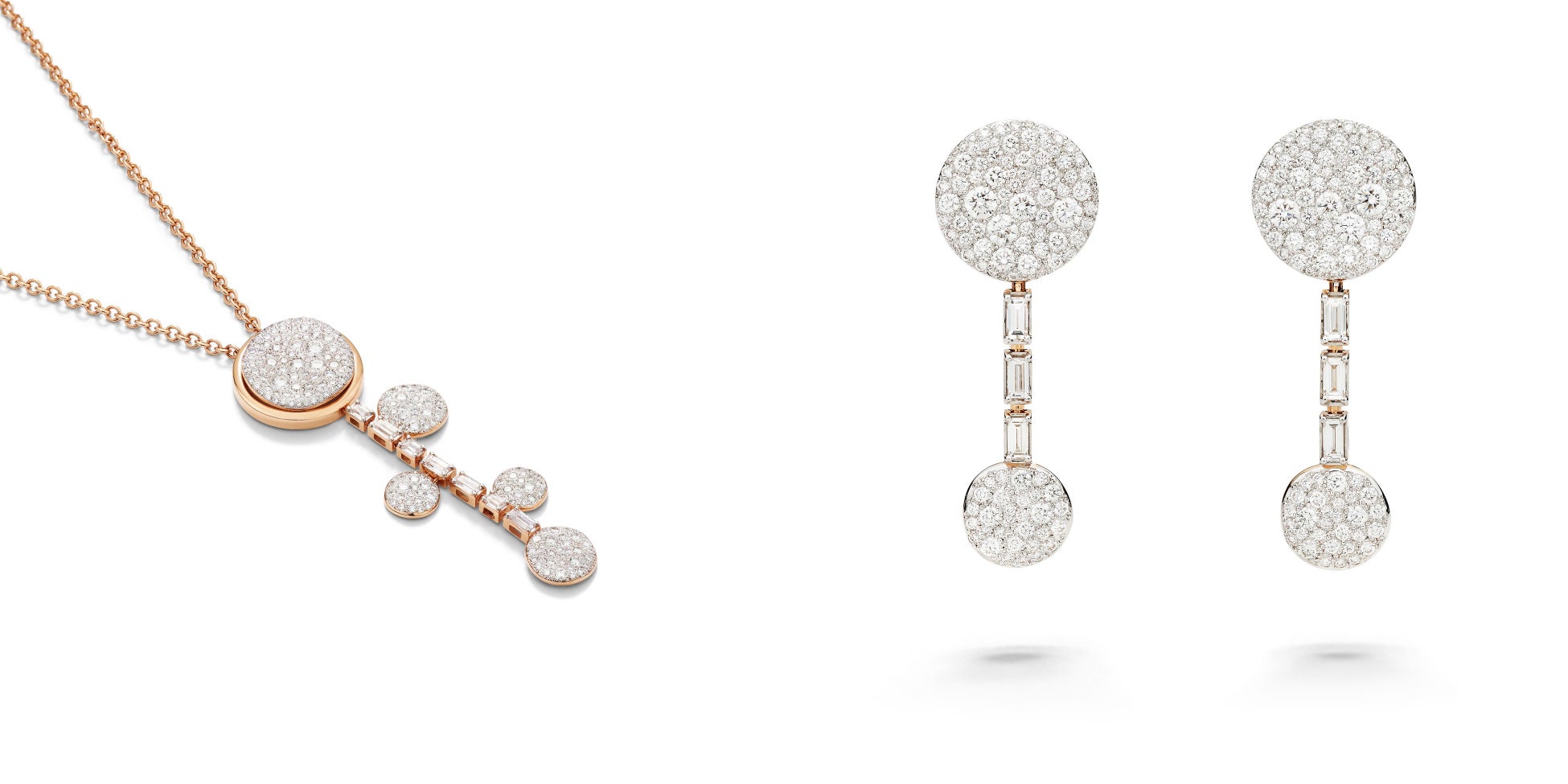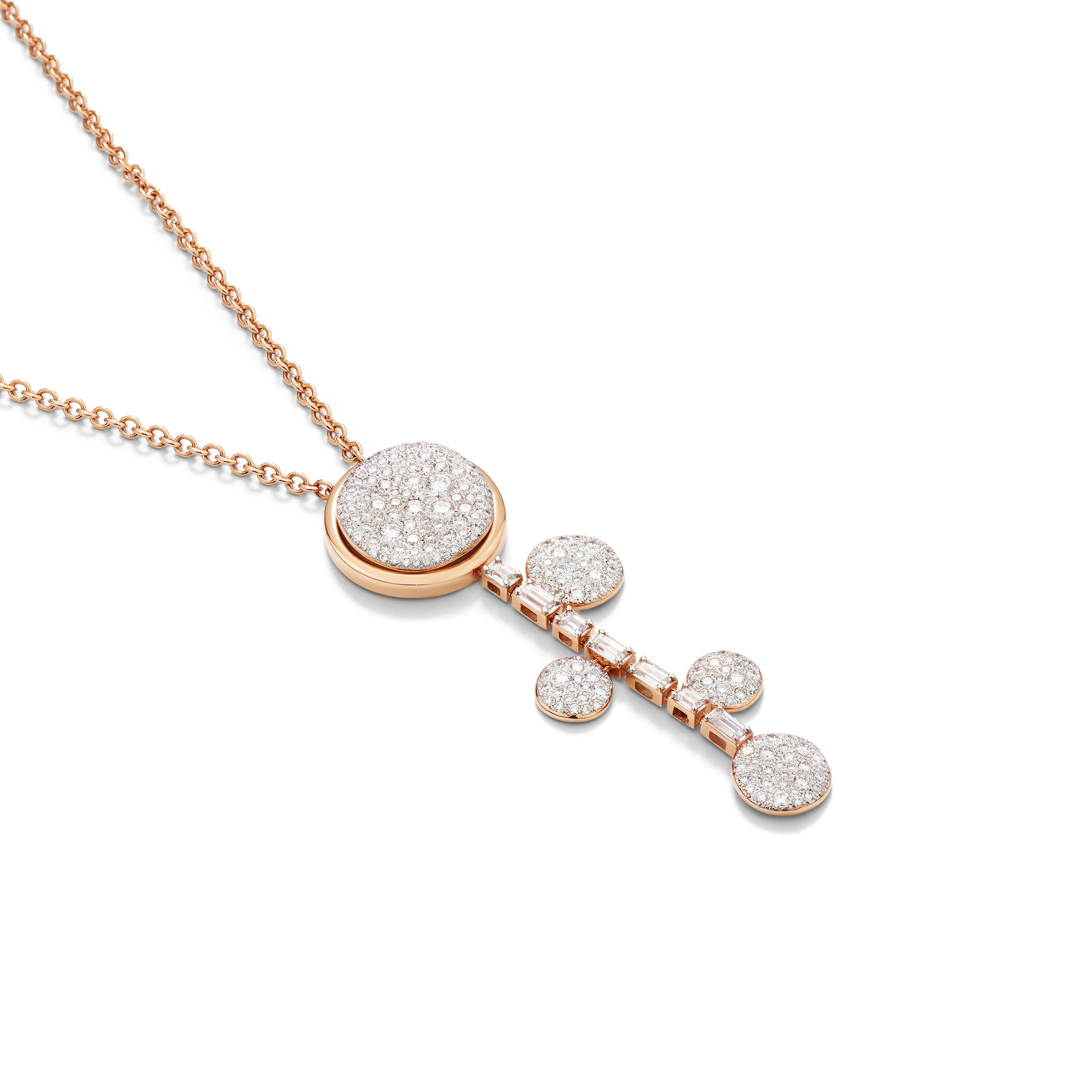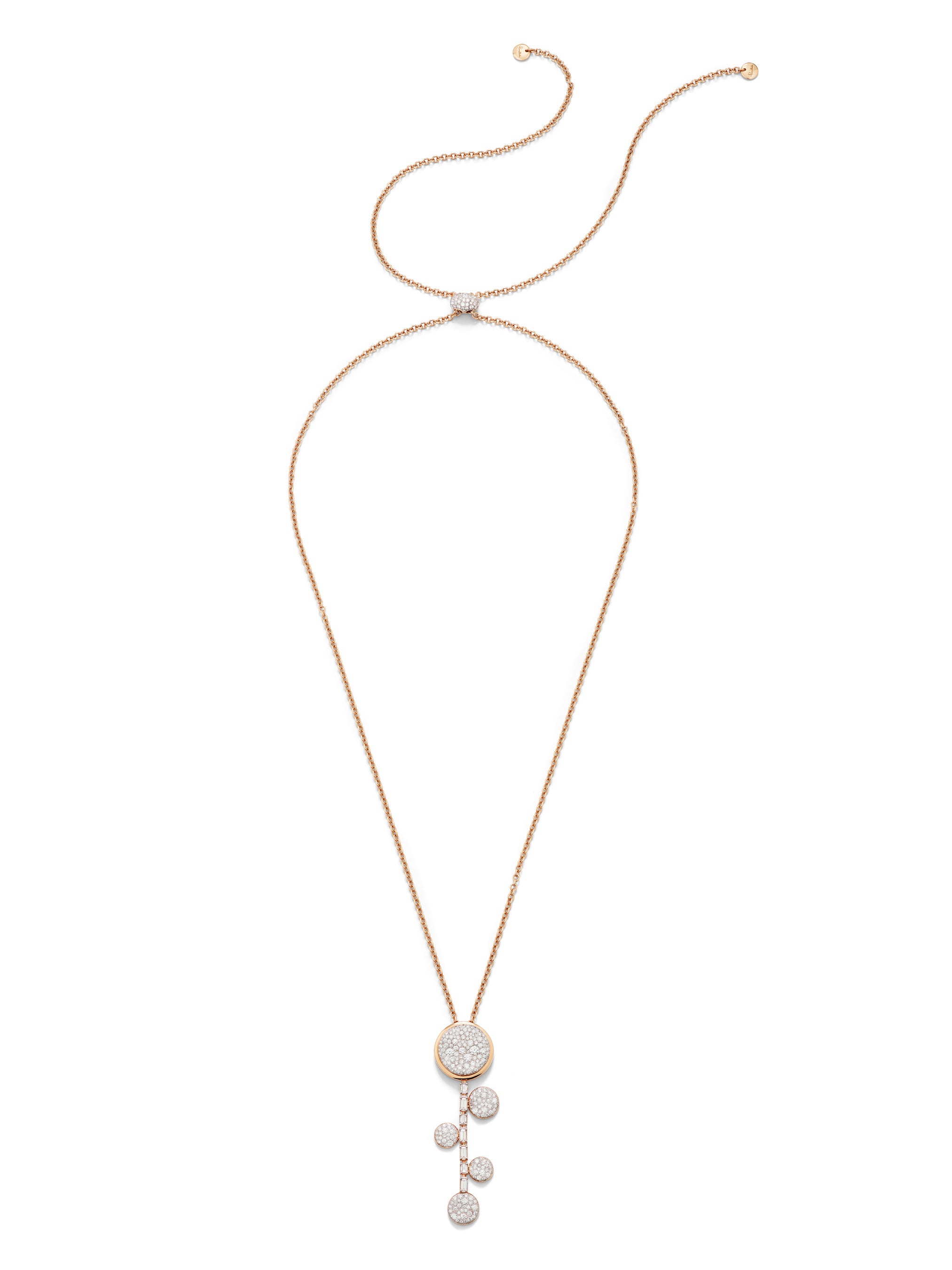 今回登場したローズゴールドにブリリアントカットとバゲットカットのホワイトダイヤモンドを組み合わせたダイナミックな新作デザインのなかでもメインとなっているのは、アイコニックな「サッビア」ディスクにホワイトダイヤモンドのパヴェをほどこしたラリアットネックレスです。バゲットダイヤモンドのラインと、小さな「サッビア」ディスクが連なるカスケードが華やかさと動きを添えています。