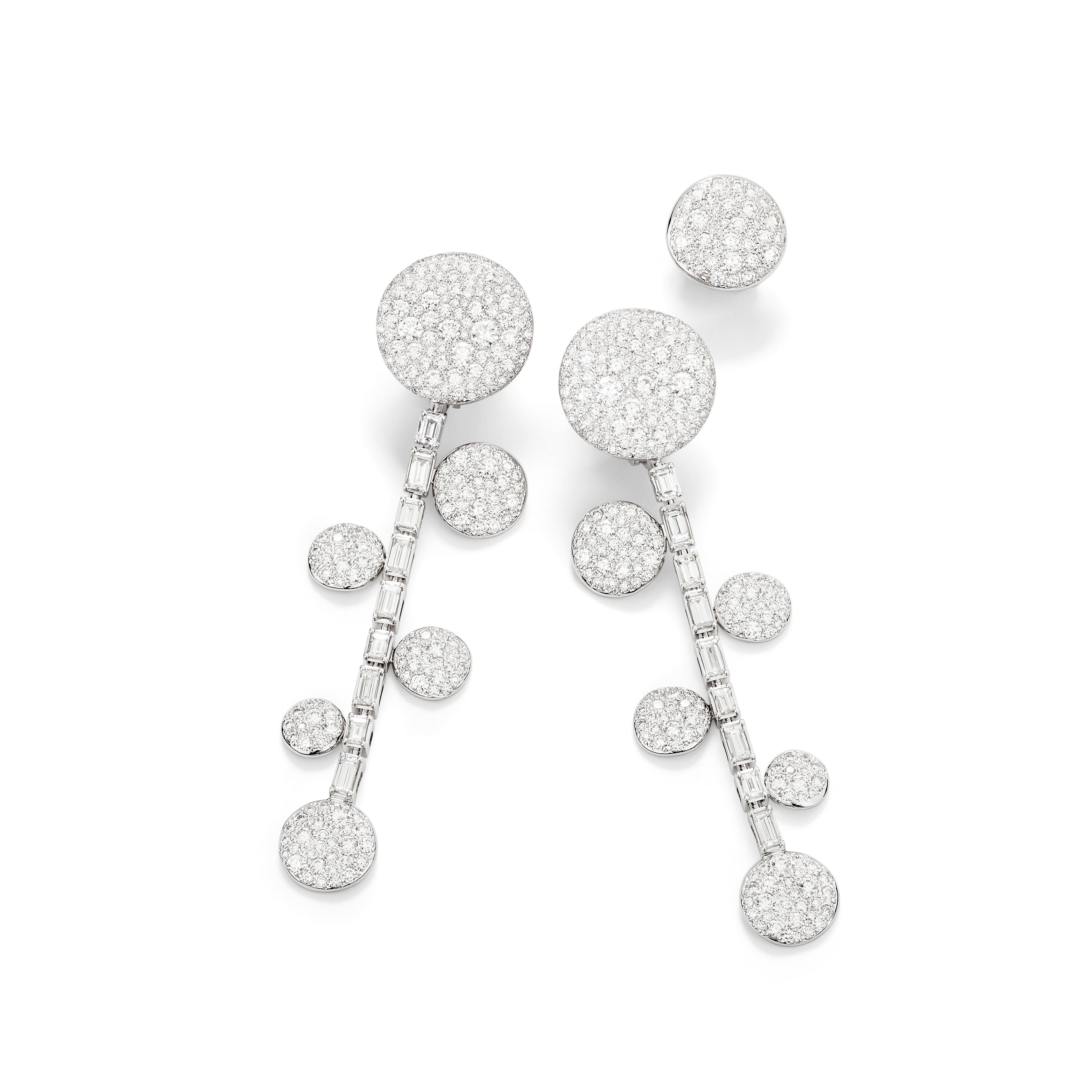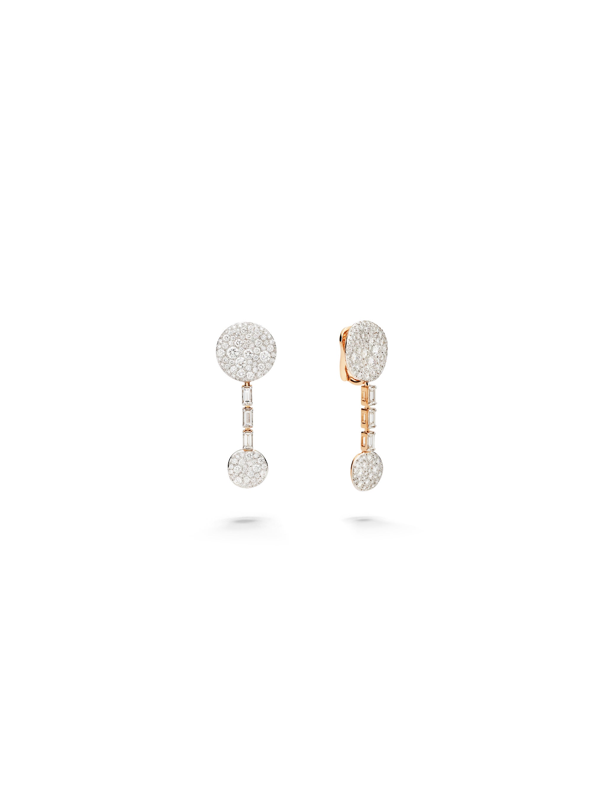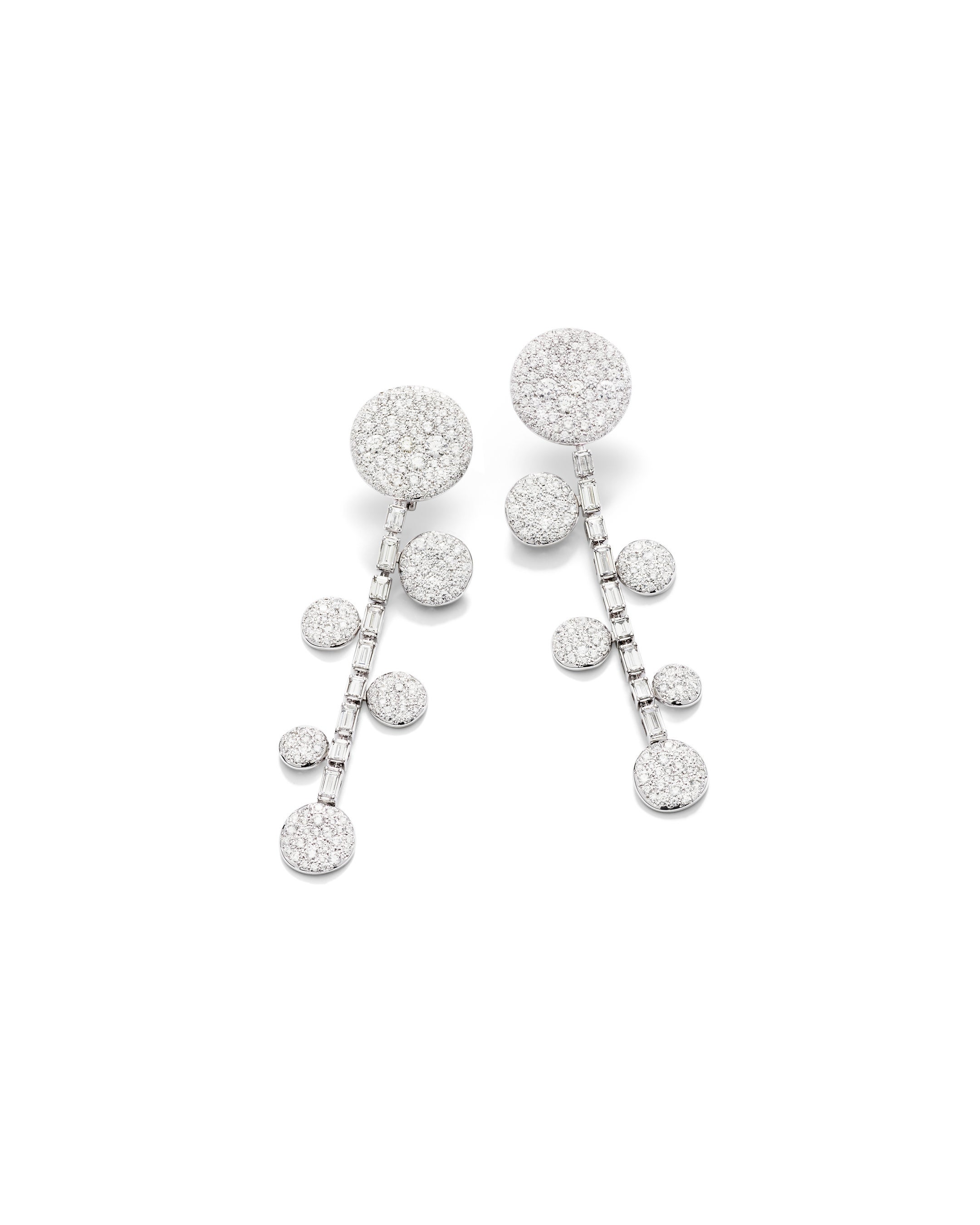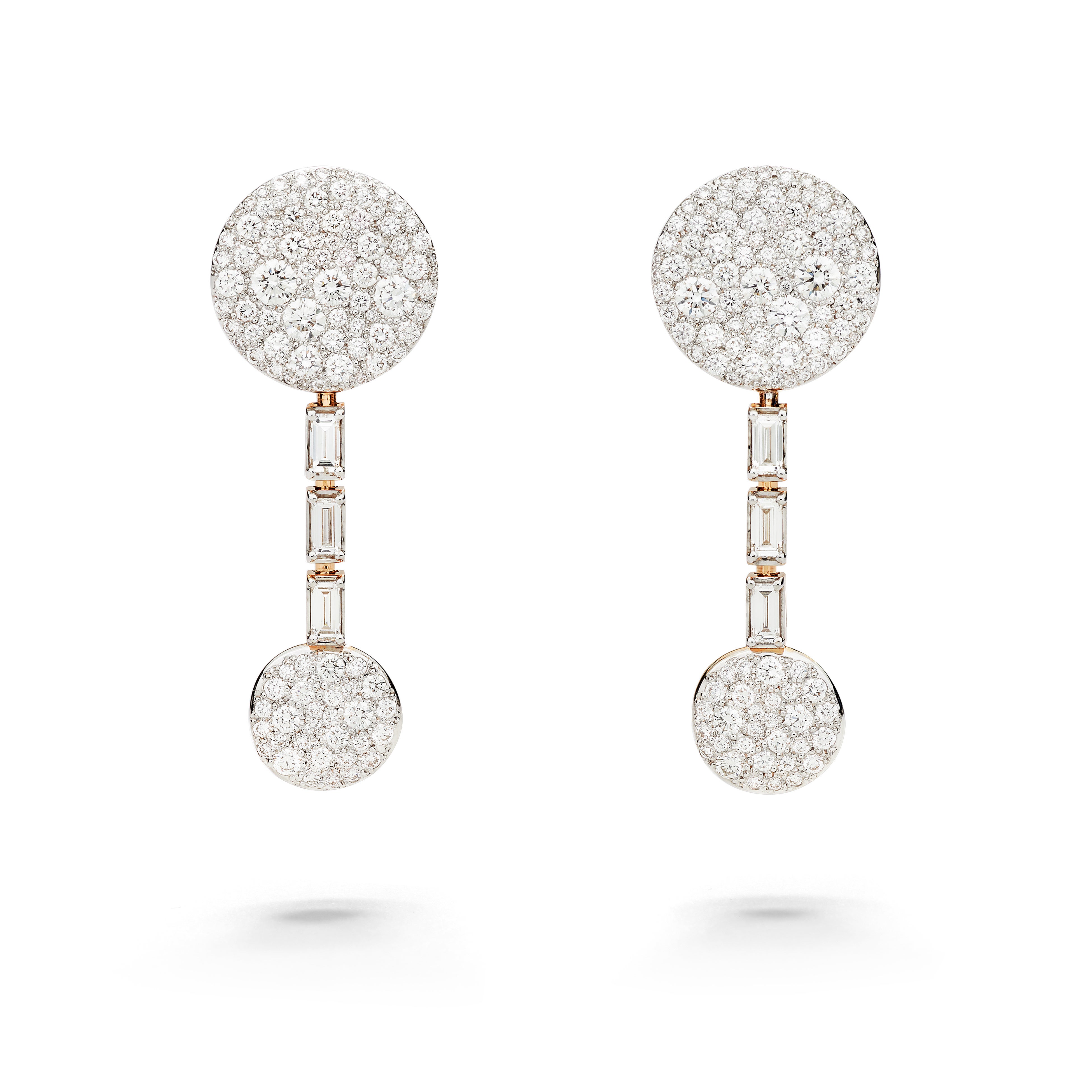 アイコニックな「サッビア」ディスクに、バゲットカットのホワイトダイヤモンドの流れと小さなディスクを組み合わせたペンダントイヤリングは光のきらめきを巧みに操り、女性が持つ本来の美しさを一層引き立てます。