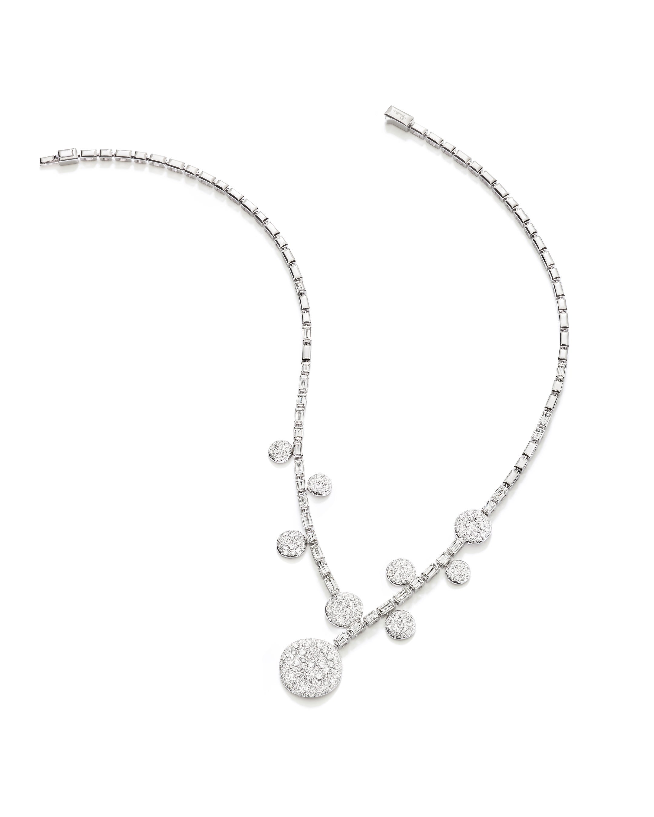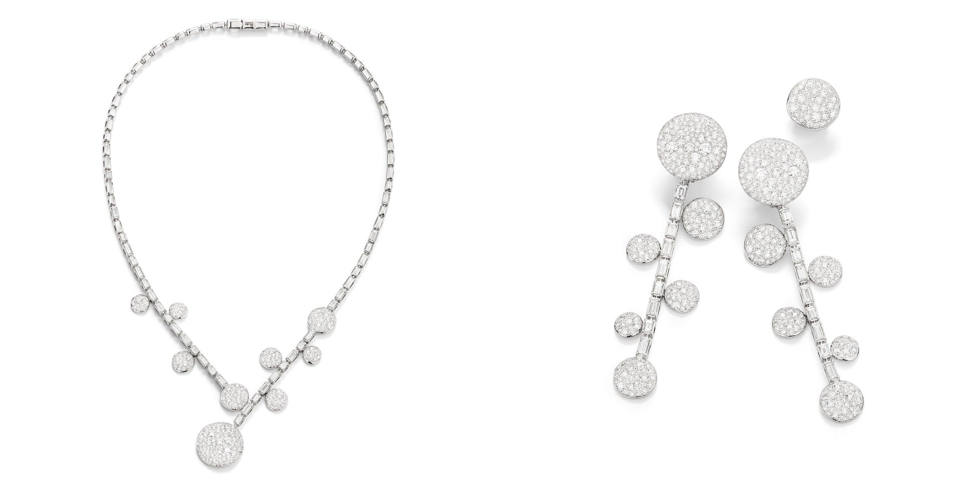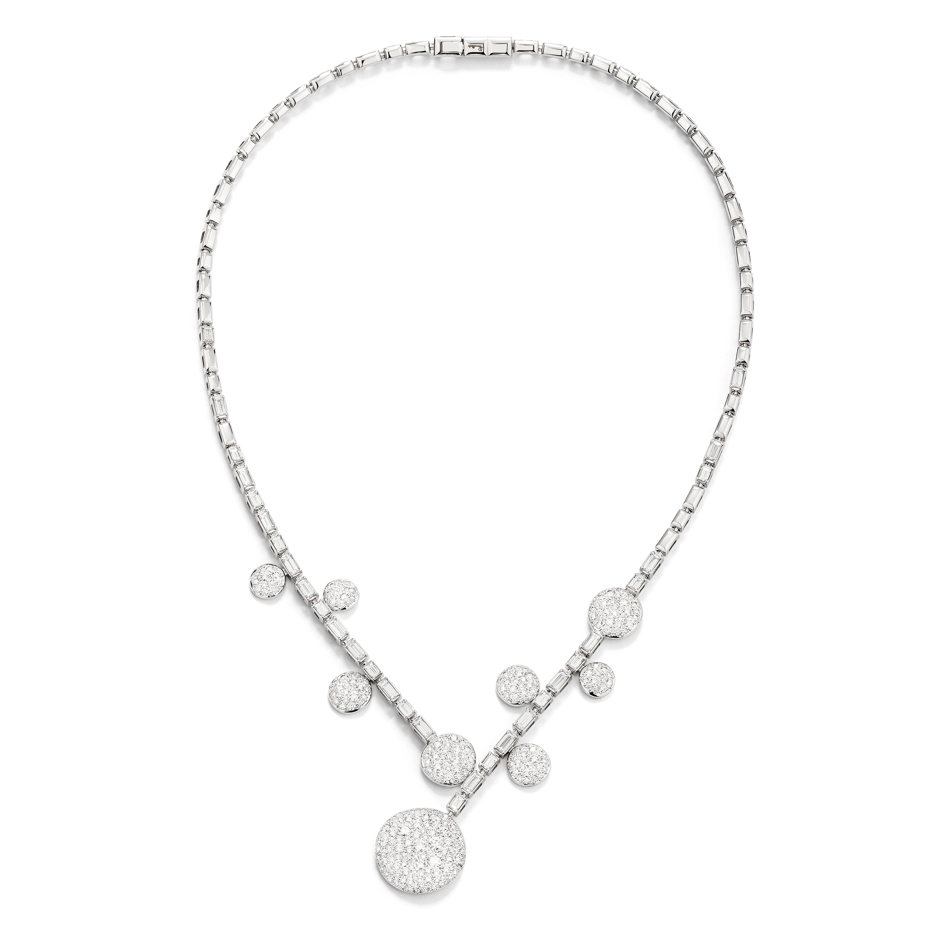 主役は、新たなスタイルを表しているネックレスです。洗練されたデザインが軽やかさを生み出し、敷き詰められたダイヤモンドとホワイトゴールドの対比が、現代的な表情を際立たせています。