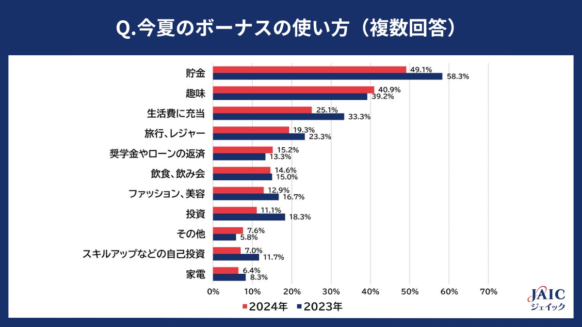 「今夏のボーナスを、どんなことに使いましたか?(使う予定ですか?) 当てはまるものを全て選択してください」と質問したところ、「貯金」が49.1%、「趣味」が40.9%、「生活費に充当」が25.1%、「旅行、レジャー」が19.3%、「奨学金やローンの返済」が15.2%、「飲食、飲み会」が14.6%、「ファッション、美容」が12.9%、「投資」が11.1%、「その他」が7.6%、「スキルアップなどの自己投資」が7.0%、「家電」が6.4%となりました。2023年の結果と比較しても、上位はともに、1位「貯金」、2位「趣味」、3位「生活費に充当」という結果となりました。
