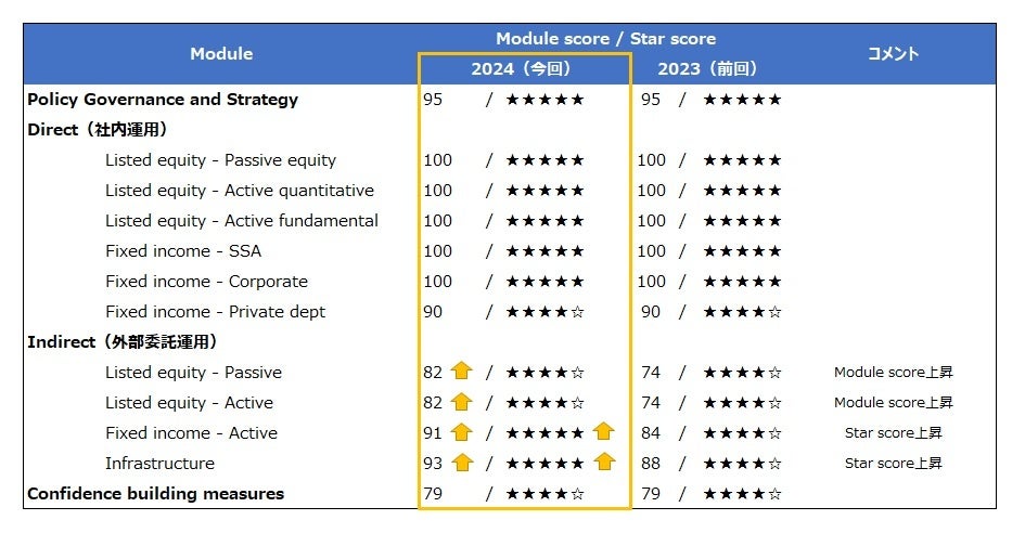 PRIの年次評価は、ESG運用に対する取り組みの質や網羅性を測るうえで重要なメルクマールになるものと考えています。今回の評価では、全体方針となる「ポリシー・ガバナンス・戦略」のほか、インハウス運用の上場株式3項目、同運用の債券2項目、外部委託運用2項目で最高評価である「5つ星」を獲得しました。特に外部委託の評価が過去と比較し向上しており、理由は外部の運用会社との契約時やモニタリングにおいて、責任投資の観点を強化したことであると考えています。