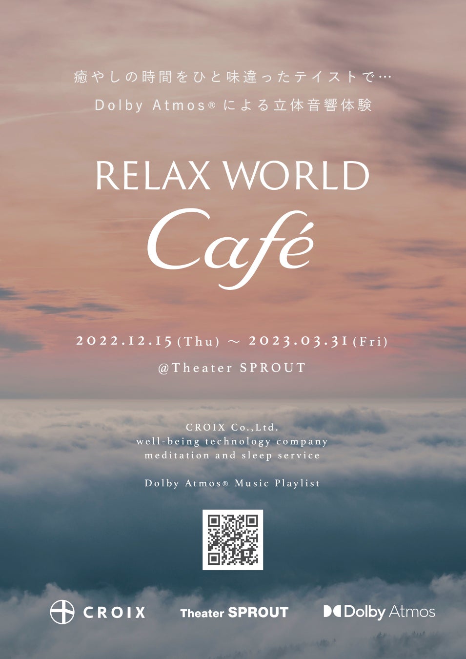 ウェルビーイング・テクノロジー事業を行う株式会社クロア(本社:東京都目黒区、代表取締役社長:戸部田馬準)が運営するレーベル「クロアヒーリング」は、レンタルシアター「Theater SPROUT」とDolby Atmosミックスによるヒーリングミュージックの【無料イベント】「RELAX WORLD Café」を行います。