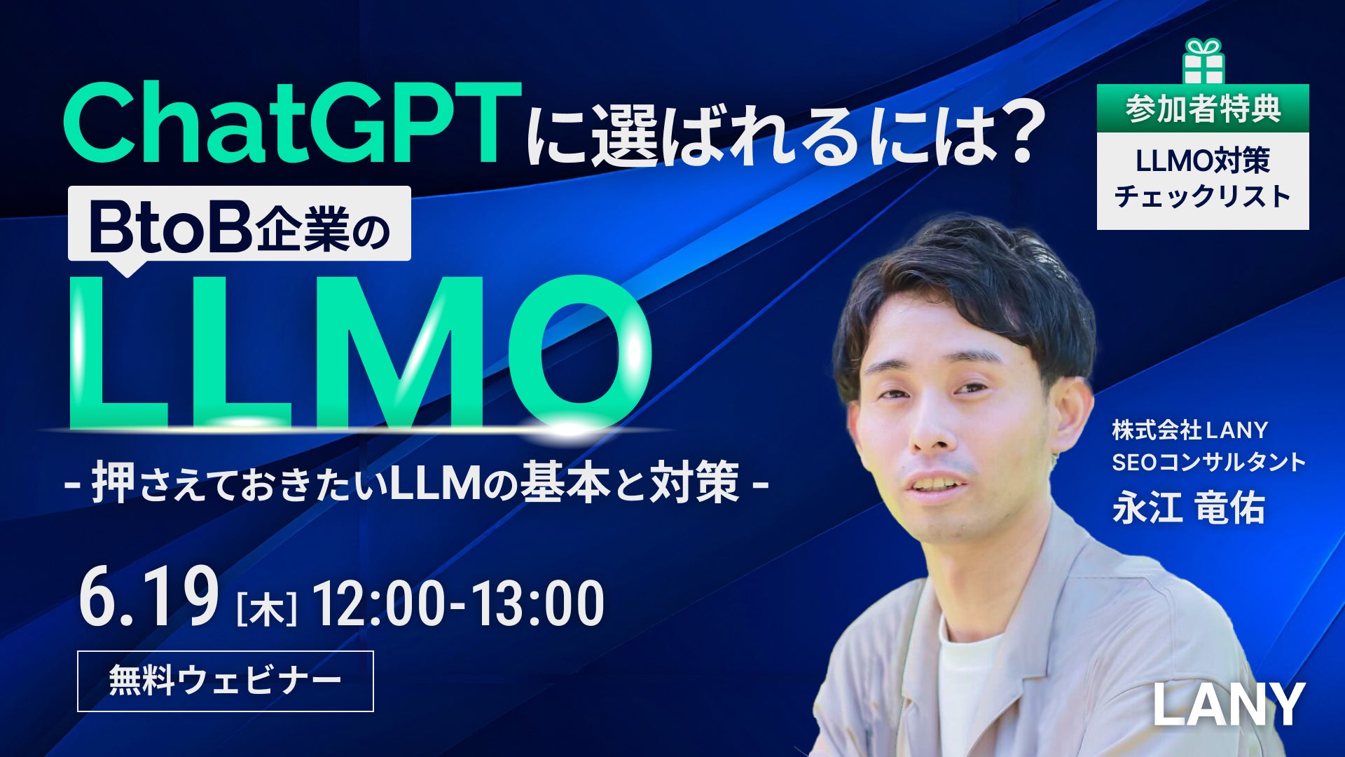 デジタルマーケティング支援を提供する株式会社LANY(東京都渋谷区、代表取締役社長:竹内渓太)は、【無料ウェビナー】ChatGPTに選ばれるには?BtoB企業のLLMO-押さえておきたいLLMの基本と対策-を6/19(木)に開催いたします。