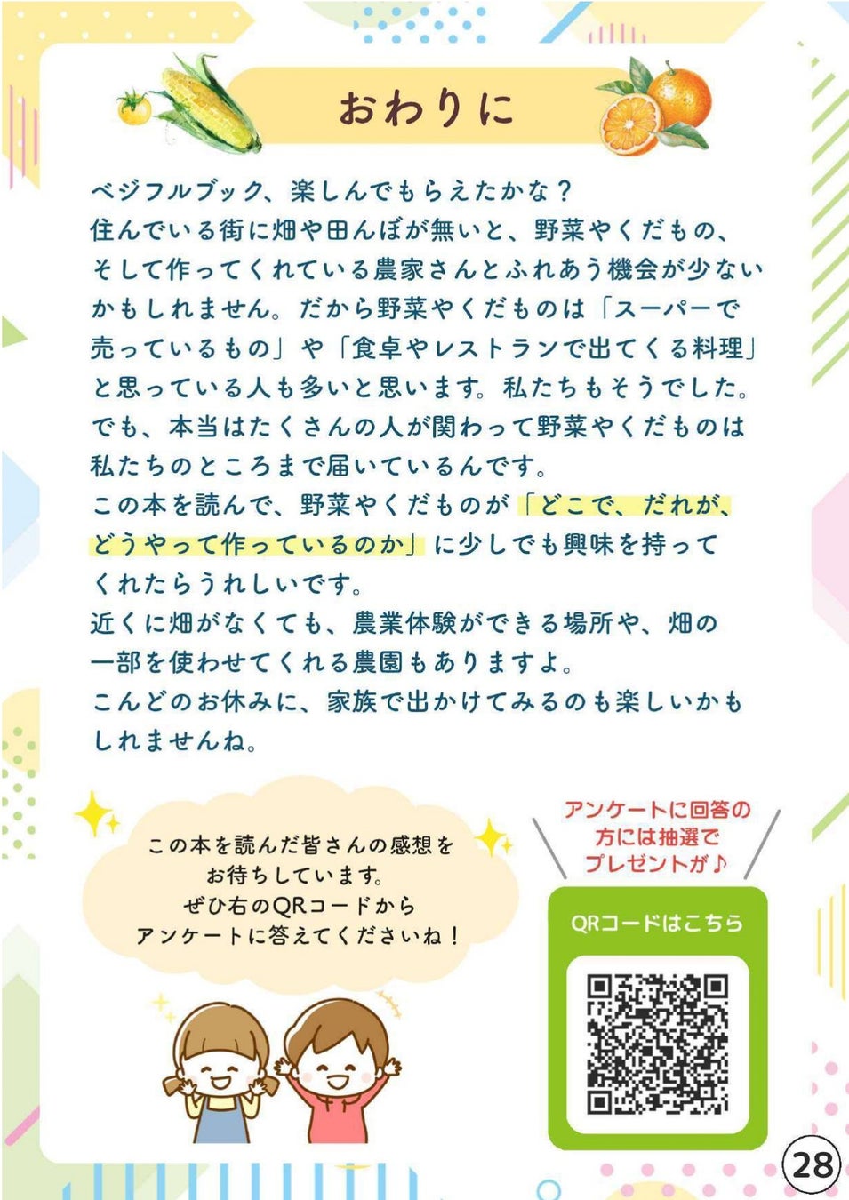 ベジフルブックは、千代田区のこどもたちが、農作物への親しみをもつきっかけになるとともに、自分たちの消費行動が社会や環境に影響を与えていることを知ってもらうために作成しました。是非、楽しみながら日本の農業を考える題材としてご利用ください。