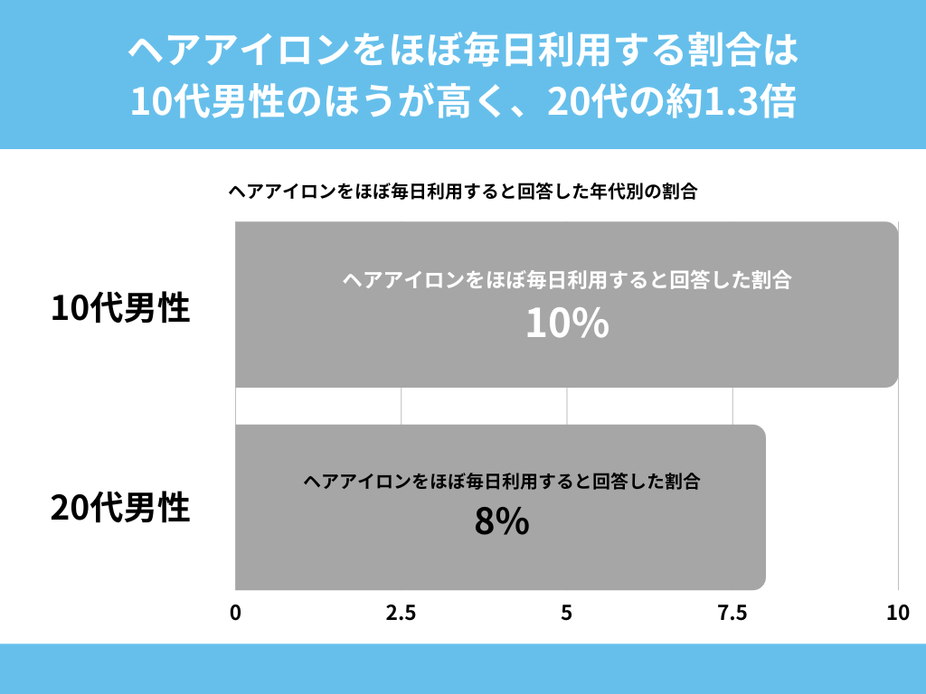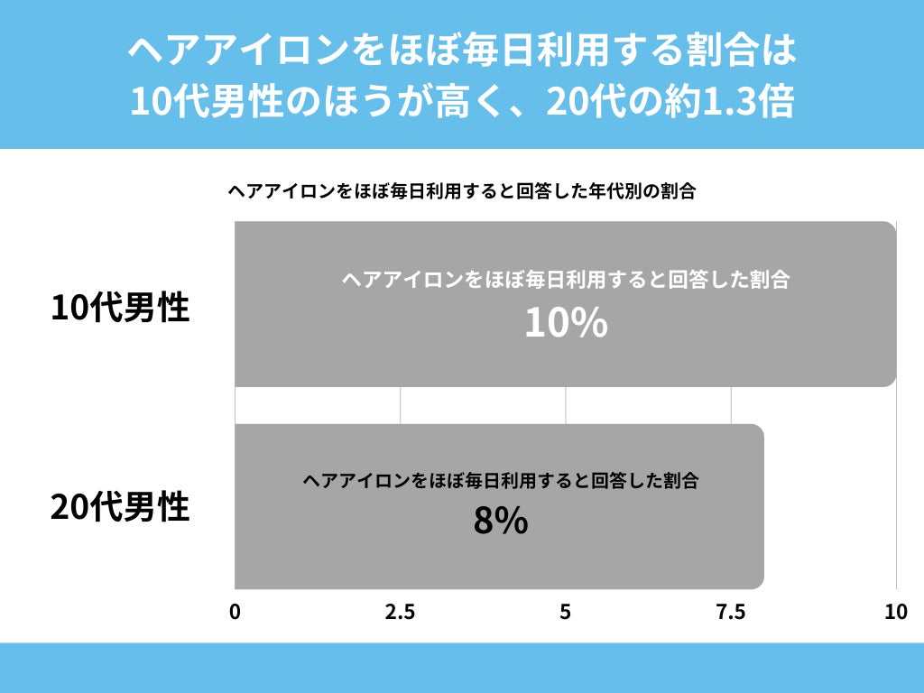 【ヘアアイロンをほぼ毎日利用する割合は10代男性のほうが高く、20代の約1.3倍】