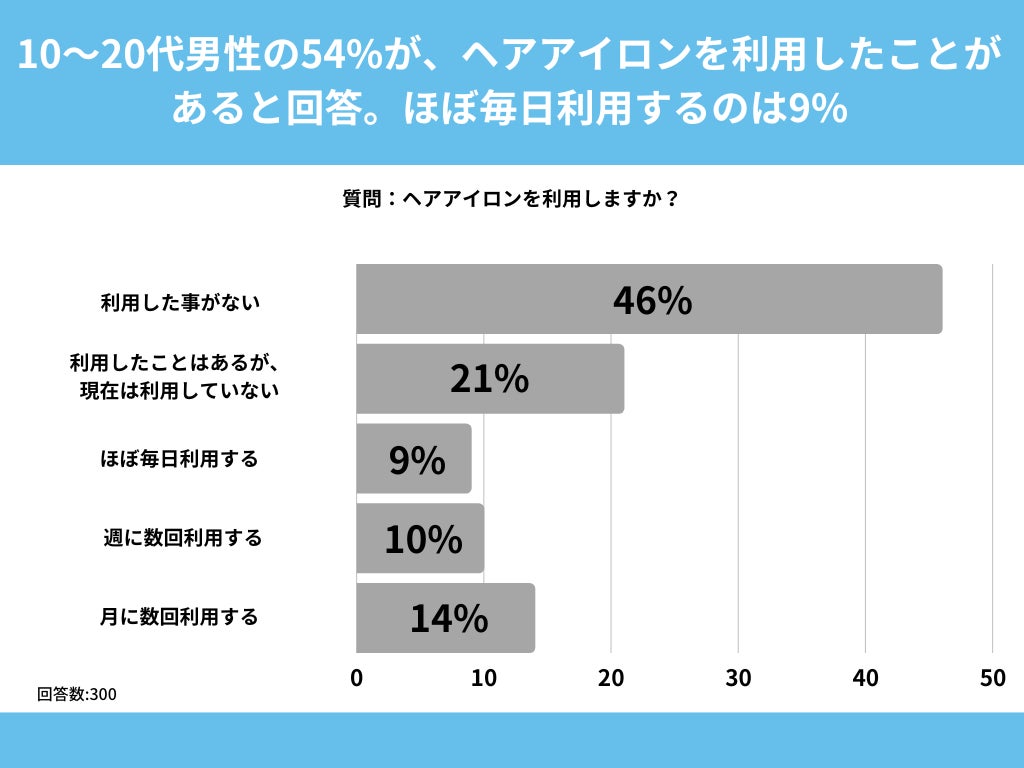 10~20代男性の54%が、ヘアアイロンを利用したことがあると回答。ほぼ毎日利用するのは9%【ヘアアイロンに関するアンケート】