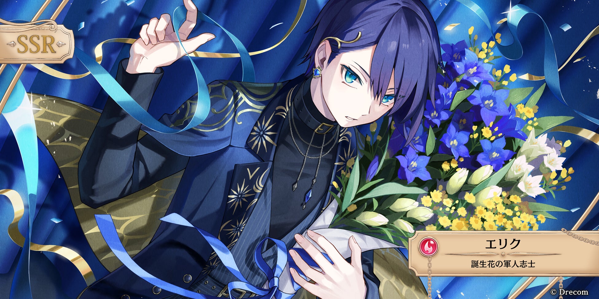 本ガチャでは、バースデー仕様の特別なスーツに身を包んだ「エリク」の『SSR[エリク]誕生花の軍人志士』が新登場!