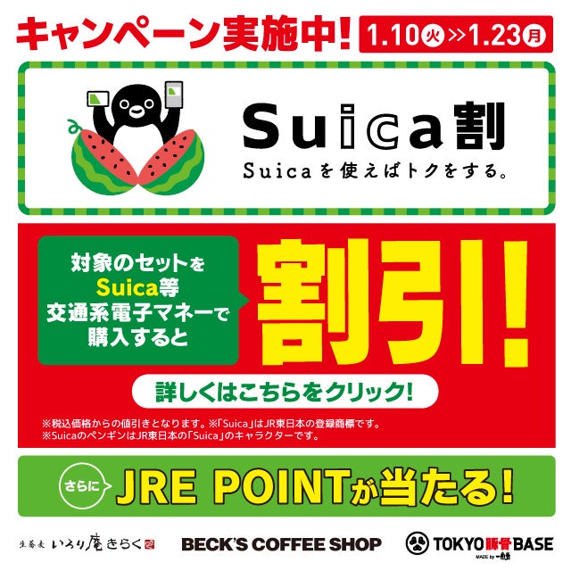 エキナカ店舗で、Suicaでお得に割引!賢くポイ活!Suica割(スイカわり)&JRE POINT プレゼントキャンペーンを行います約140店舗で、1月10日(火)から1月23日(月)まで