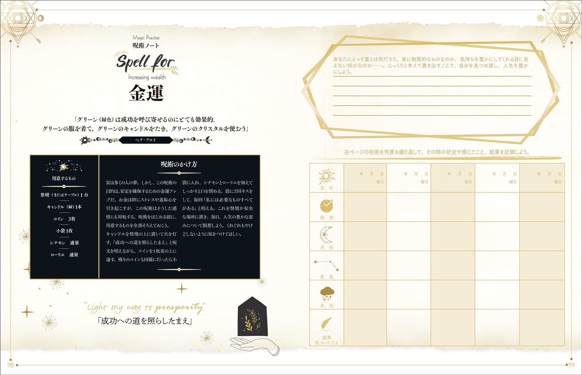 本書後半では、実践できる12の呪術を「呪術ノート」形式で紹介。繰り返し鍛錬する呪術の実践結果とともに、日時や星座、月相などを記録できます。あなたの呪術経験はあなただけのもの。呪術で何を達成できるかはあなた次第です。