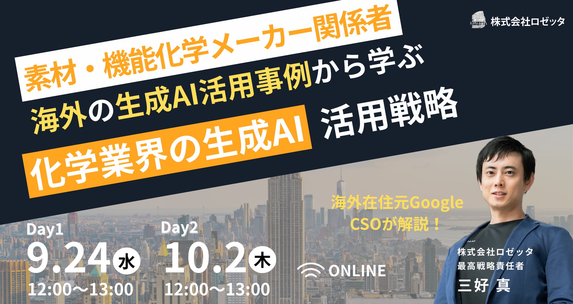 メタリアル・グループの株式会社ロゼッタ(代表取締役:五石 順一)は、無料オンラインセミナー「AI導入の一歩が競争力を決める ─海外先進事例に学ぶ素材・機能化学メーカーの生産革新!」を9月24日(水)および10月2日(木)に開催いたします。