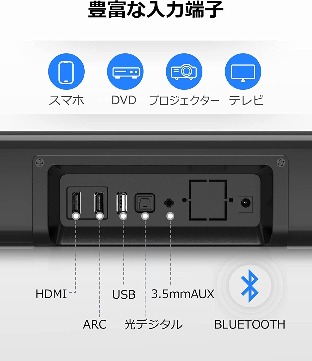 OTICサウンドバーはテレビスピーカーとして光デジタル、HDMIとARC対応です。また、Bluetoothでマートフォン、パソコンなど幅広いデバイスを簡単にワイヤレス接続することもできます。更に、USB接続やAUXケーブル、光デジタルケーブルにも対応しているため、MP3プレイヤーやプロジェクターなどとも接続することができます。