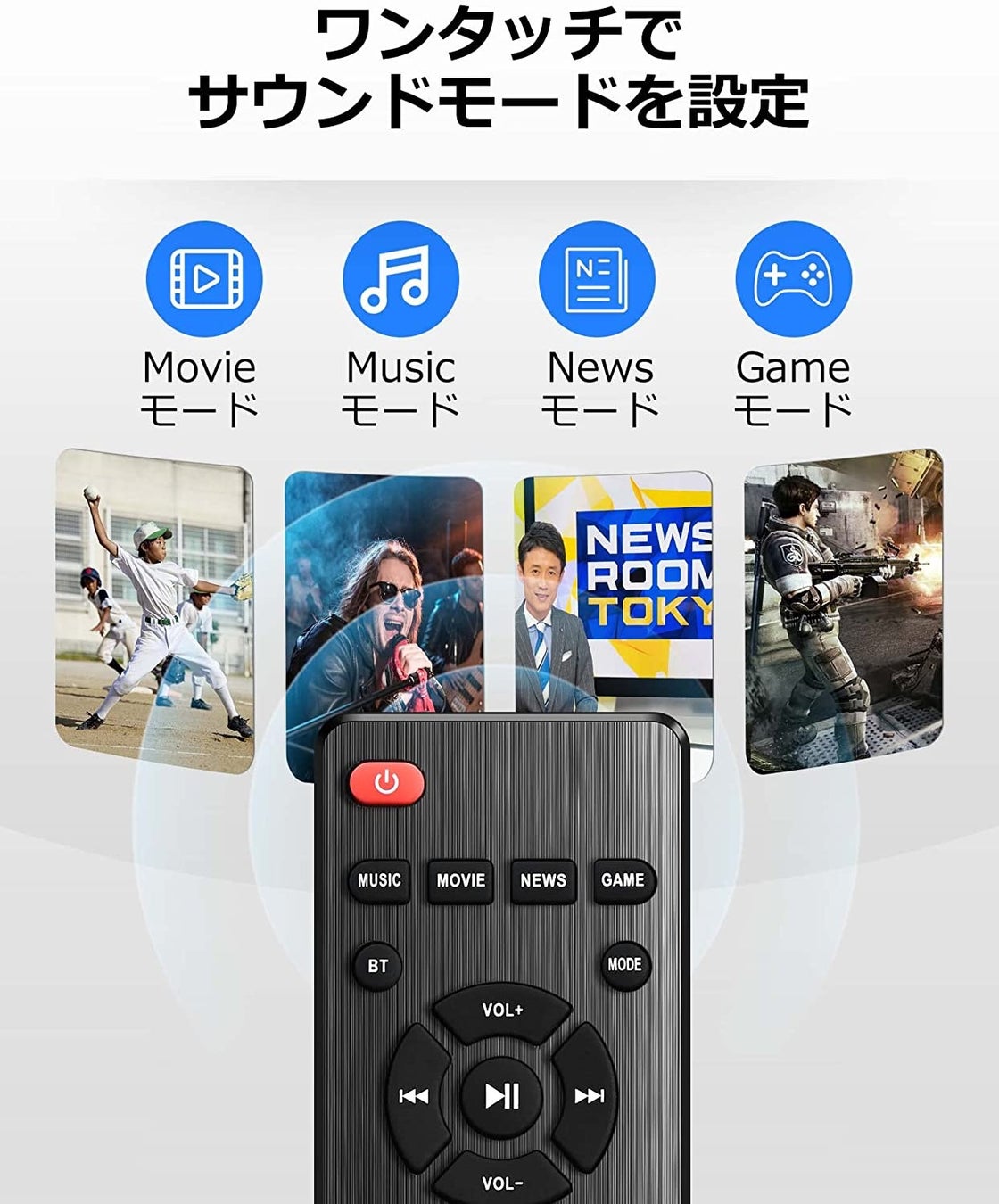 OTICの最適なサウンドモードで、映画や音楽、ニュース、ゲームのサウンドを楽しめます。音楽再生に最適な「ステレオ」、ほとんどのニュースに対応した「スタンダード」、空間の広がりを強調する「映画」、ゲームコンテンツに没頭できる「ゲーム」など個々のサウンドアクションの定位をクリアで正確に再現します。音に質を感じると言うほどあらゆるモードに最適で、高品質な雰囲気を出してくれます。