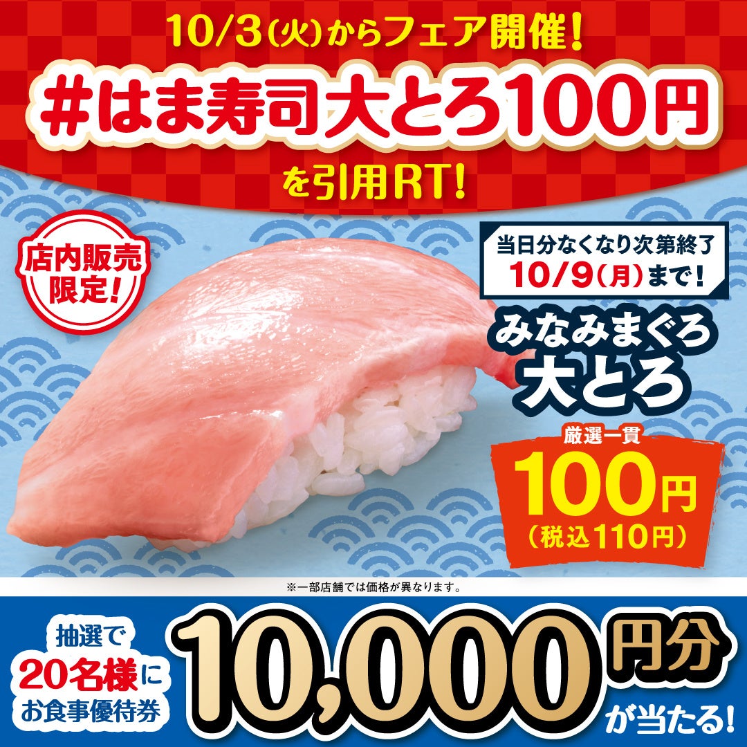 さらに、フェア開催を記念し、X(旧Twitter)のはま寿司公式アカウントにて、抽選で20名様に10,000円分のお食事券が当たるキャンペーンを実施します。ふるってご参加ください!