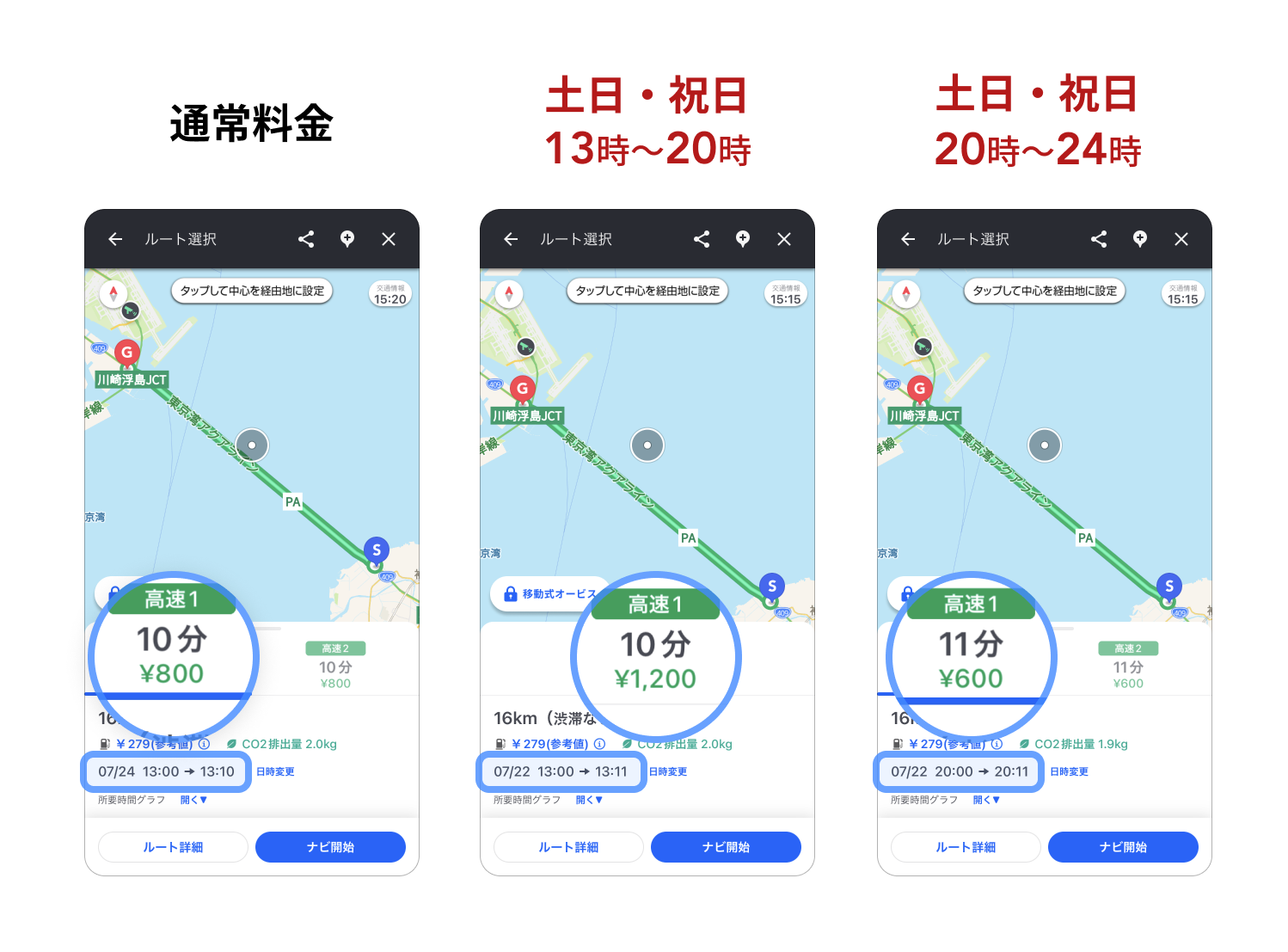 設定は不要で、日時や曜日に応じて自動的に検索結果に反映されるため、「カーナビに表示されている料金と実際の料金が違う」といった課題の解決や、「週末に車で移動する際の正しい料金を確認したい」といった際に活用できます。