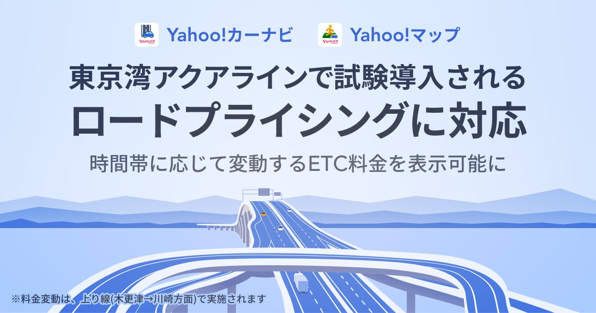 ヤフー株式会社(以下、Yahoo! JAPAN)が提供するカーナビアプリ「Yahoo!カーナビ」(Android版、iOS版)と地図アプリ「Yahoo!マップ」(Android版、iOS版)は、本日、東京湾アクアライン上り線(木更津→川崎方面)で試験導入(※1)されるロードプライシングに対応しました。