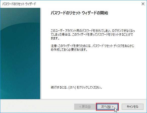 Step4:「パスワードのリセットウイザードの開始」が表示されるので「次へ」をクリックします。
