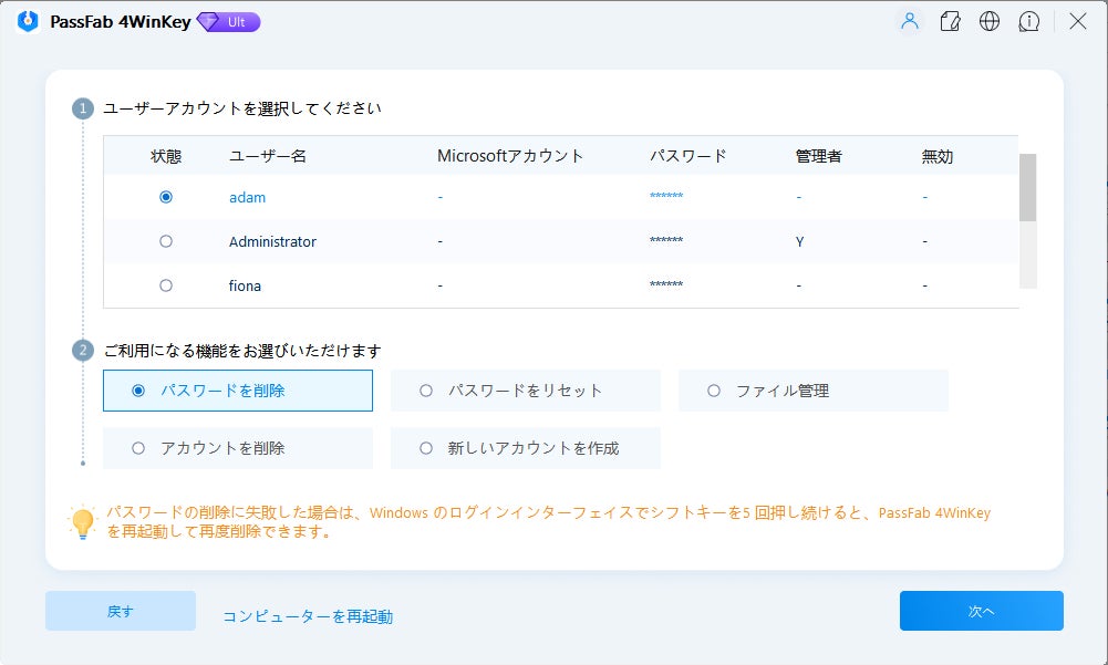 Step5:アカウントとパスワードの削除機能を選択して「次へ」をクリックします。