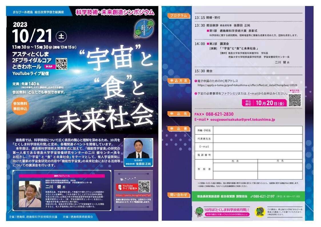 本年度は、徳島県科学技術大賞表彰式に加えて、「機能性宇宙食」の研究の第一人者である徳島大学宇宙栄養研究センターの二川 健センター長をお招きし、「“宇宙”と“食”と未来社会」をテーマとして、有人宇宙開発に向けた最新の宇宙食研究の内容や「機能性宇宙食」の未来社会における活用等についての講演会を行います。