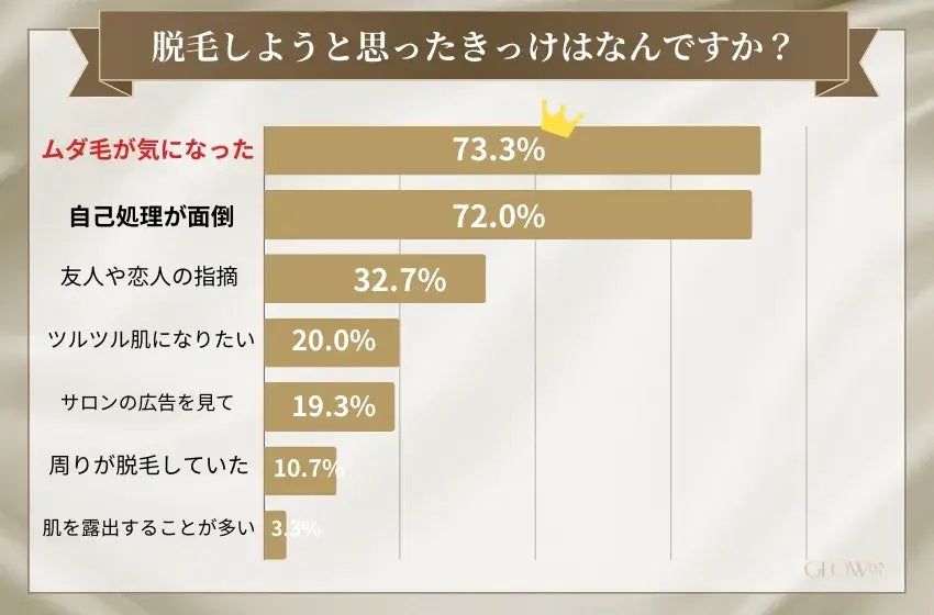 脱毛のきっかけは「ムダ毛が気になったから」が最も多く、「自己処理が面倒だから」が続く結果になりました。