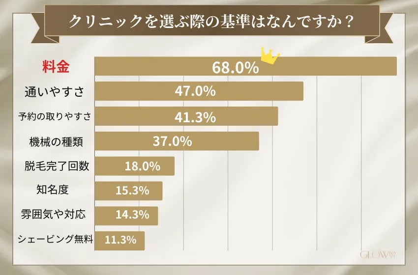クリニックを選ぶ際の基準について、「料金」という回答が最も多い結果になりました。可能な限り料金を抑えて脱毛を完了したいという人が多いと考えられます。