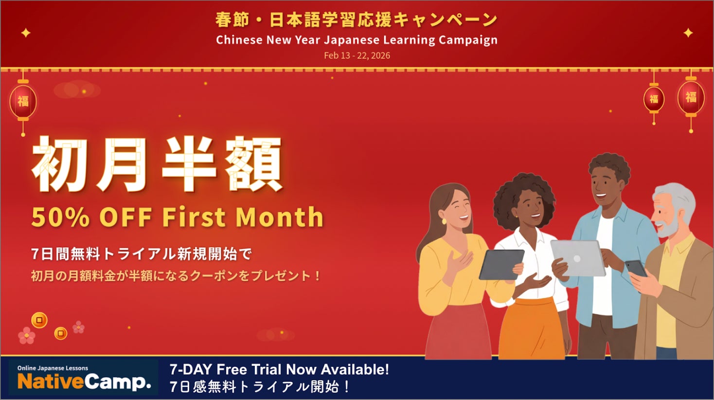 Native Camp, Inc. (Head Office: Shibuya, Tokyo; CEO: Kunihiro Tanikawa), the provider of Native Camp Japanese, announces the "Chinese New Year Japanese Learning Support Campaign," offering new users 50% off the first month's subscription fee.