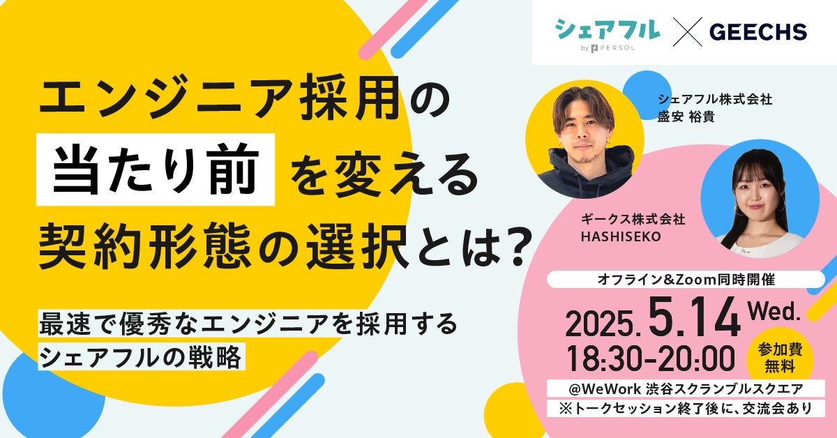 ギークス株式会社(本社:東京都渋谷区、代表取締役CEO:曽根原 稔人、以下ギークス)は、2025年5月14日(水)18:30~20:00にて、シェアフル株式会社(本社:東京都港区、代表取締役社長:横井 聡、以下シェアフル)と共催で、エンジニア採用担当者向けの無料セミナー「エンジニア採用の"当たり前"を変える契約形態の選択とは?~最速で優秀なエンジニアを採用するシェアフルの戦略~」を開催します。