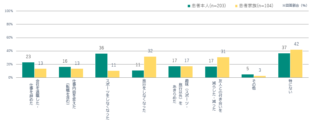 慢性心不全と診断後、患者さんはスポーツや仕事に、ご家族は旅行や友人付き合いに制限が出ている方が多く、患者さん・ご家族の双方に負担がかかっていることが推察されました。