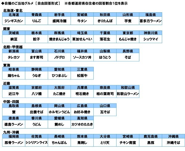 各都道府県の在住者(各都道府県100名)に、自県の自慢のご当地グルメを聞いたところ、北海道では「ジンギスカン」、岩手県では「盛岡冷麺」、宮城県では「牛タン」、秋田県では「きりたんぽ」、福島県では「喜多方ラーメン」、栃木県では「餃子」、群馬県では「焼きまんじゅう」、埼玉県では「草加せんべい」、新潟県では「タレカツ」、富山県では「ます寿司」、福井県では「ソースカツ丼」、山梨県では「ほうとう」、岐阜県では「鶏ちゃん」、静岡県では「うなぎ」、愛知県では「ひつまぶし」、滋賀県では「近江牛」、大阪府では「たこ焼き」、奈良県では「柿の葉寿司」、島根県では「出雲そば」、岡山県では「ホルモンうどん」、山口県では「瓦そば」、徳島県では「徳島ラーメン」、佐賀県では「シシリアンライス」、熊本県では「馬刺し」、沖縄県では「沖縄そば」といった回答が挙げられました。