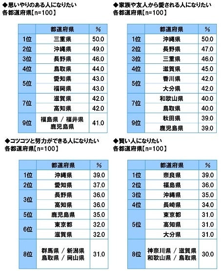 ◆思いやりのある人になりたい 1位「三重県」、家族や友人から愛される人になりたい 1位「沖縄県」