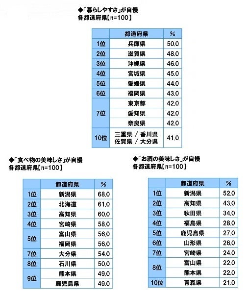グルメについてのランキングをみると、【食べ物の美味しさ自慢】では1位「新潟県」(68.0%)、2位「北海道」(61.0%)、3位「高知県」(60.0%)、【お酒の美味しさ自慢】では1位「新潟県」(52.0%)、2位「高知県」(43.0%)、3位「秋田県」(34.0%)と、新潟県が二冠となりました。(図2)(図3)