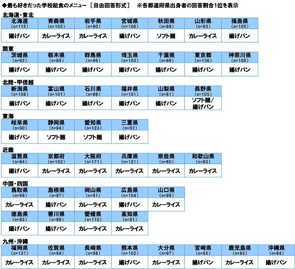 出身都道府県別にみると、関東と北陸・甲信越では揚げパン一強、近畿と九州・沖縄ではカレーが優勢となり、北海道・東北と中国・四国では揚げパンとカレーが拮抗、東海では揚げパンとソフト麺が拮抗しました。東日本では「揚げパン」が1位、西日本では「カレーライス」が1位となる都道府県が多い傾向がみられました。