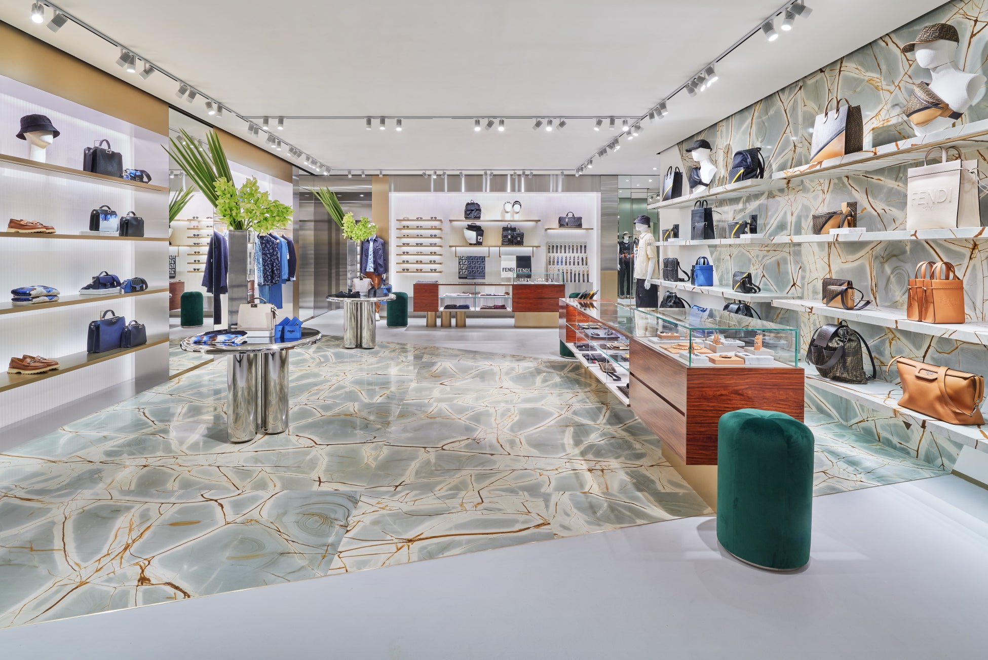 印象的なファサードに導かれて店内に足を踏み入れると、人々を包み込む優しい温もりと壮麗さにあふれたスペースが広がります。店内のインテリアは、フェンディのコードとデュアリズムの伝統を、まるで素材を駆使して遊んでいるかのように表現しました。ラフなコンクリートのコラムやビームに、大理石やシャンパンメタル、スティール、プラッシュカーペットのラグジュアリーなタッチが対比して、アクセントが生まれます。床と壁は素材を交互に配置することで奥行きを出し、ディスプレイされた各コレクションのための特別なバックグランドとなります。さらにアラベスカートバーリ大理石、ブラックとホワイトのパタゴニア大理石、ホワイトリスタル、ブルーのローマ大理石が各フロアをリッチに飾り、それぞれ異なる雰囲気やカラーパレットを生み出します。
