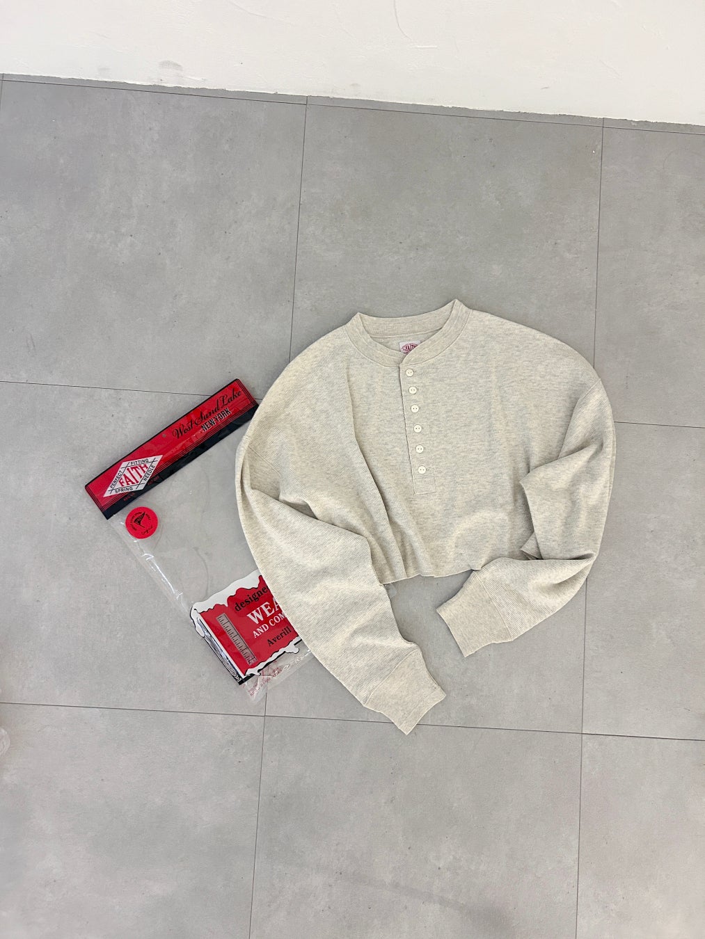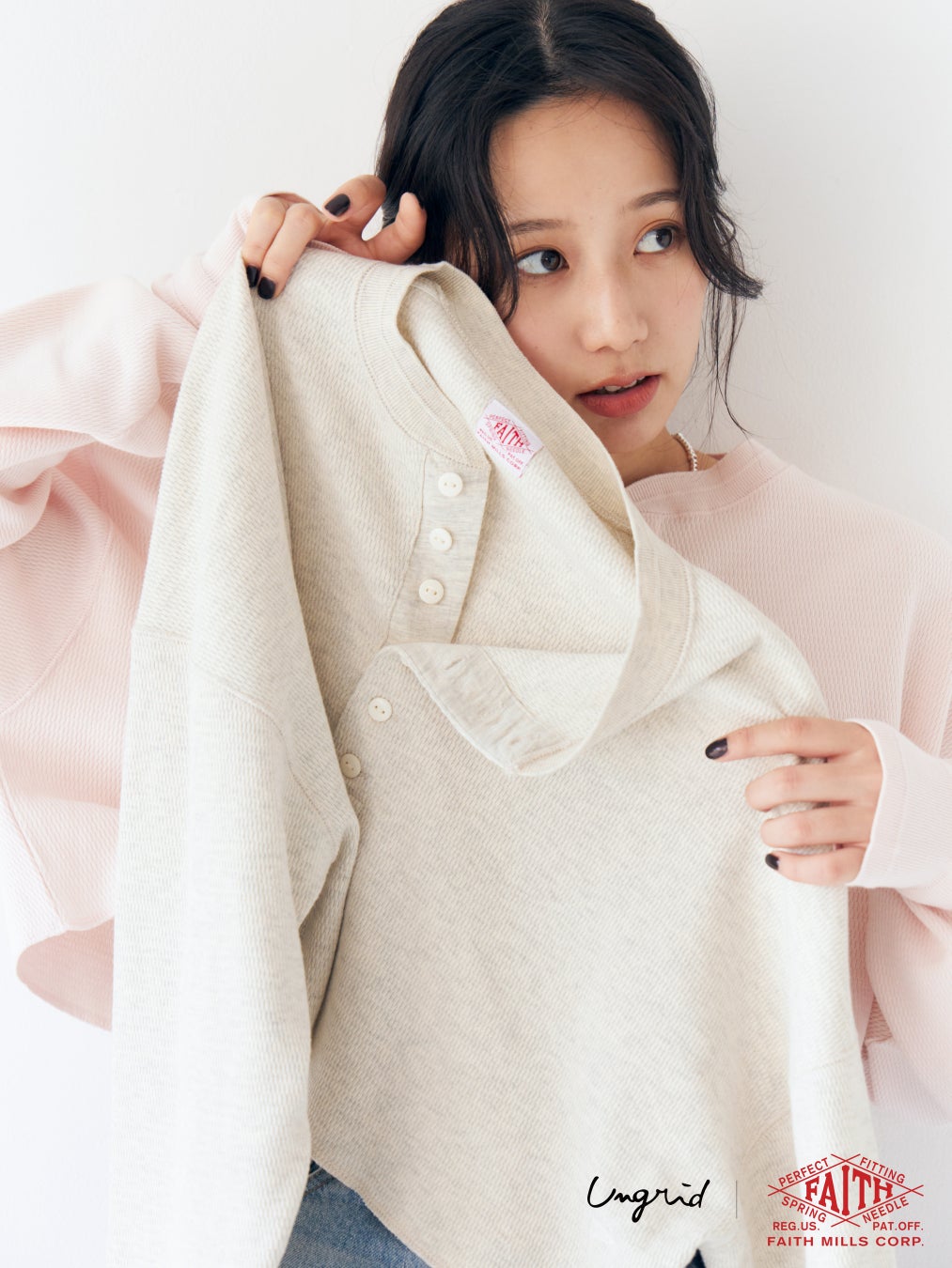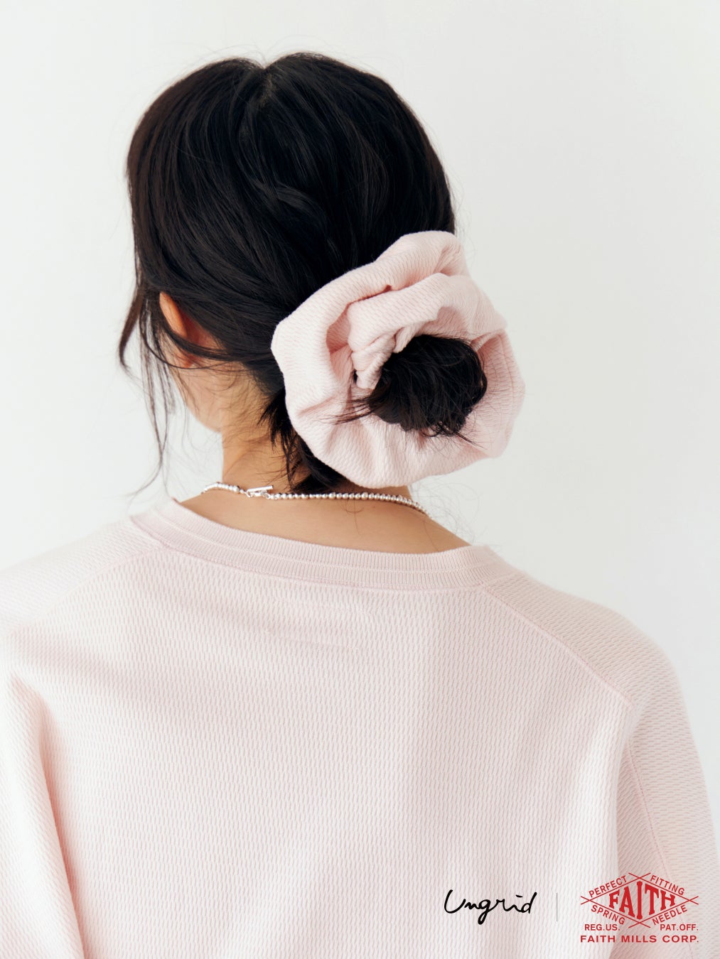 今回Ungrid初となる「FAITH MILLS(フェイスミルズ)」との別注アイテムでは、アーカイブをベースにしたハニカムロンTeeとシュシュの2型を展開します。ロンTeeはアーカイブから再現されたヘンリーネックのデザインで、ワイドシルエットにあえて大胆なショート丈を組み合わせることでカジュアルながらもUngridらしい抜け感のある一枚です。袖口にはオリジナルロゴ刺繍をあしらい特別感をプラスしました。同じハニカム素材で作られたシュシュはボリューム感を出しつつも軽やかに仕上げたアイテム。オリジナル刺繍がアクセントとなりスタイリングのワンポイントに活躍します。