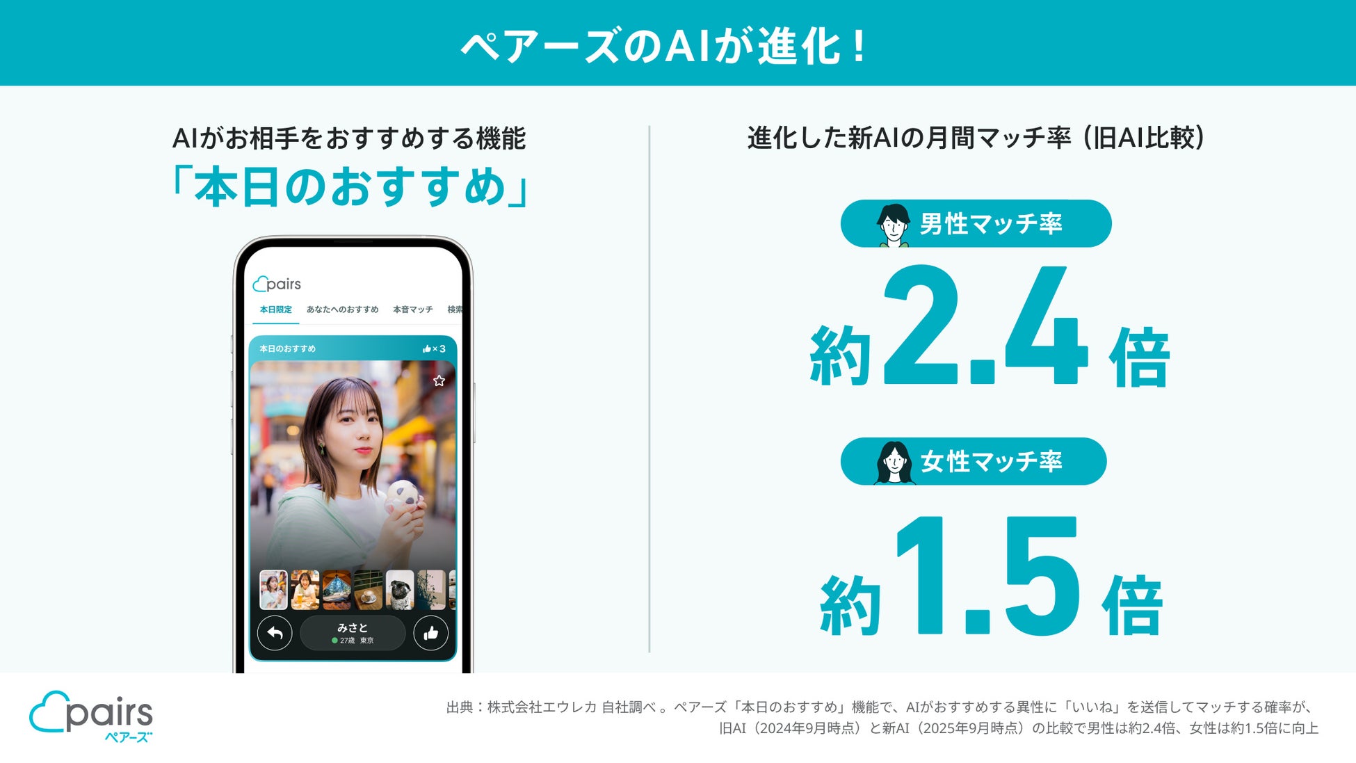 ※1 自社調べ。ペアーズ「本日のおすすめ」機能で、AIがおすすめする異性に「いいね」を送信してマッチする確率が、旧AI(2024年9月時点)と新AI(2025年9月時点)の比較で男性は約2.4倍、女性は約1.5倍に向上