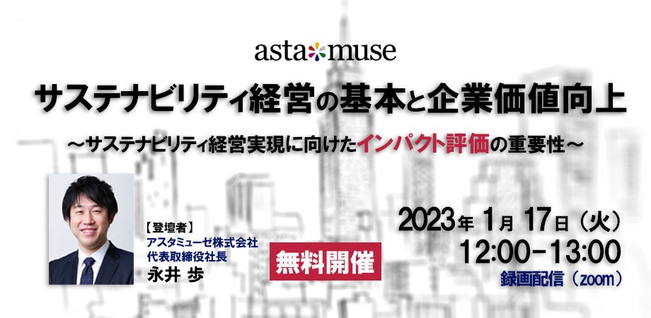 アスタミューゼ株式会社(本社:東京都千代田区、代表取締役社長 永井歩)は、2023年1月17日(火)12:00-13:00に、サステナビリティに関する課題をお持ちの経営者、経営企画、IRや広報担当者向けの無料ウェビナー「サステナビリティ経営の基本と企業価値向上~サステナビリティ経営実現において最初にやるべき事~」を開催いたします。昨年5月17日に開催し、ご好評いただいたウェビナーの録画配信となります。