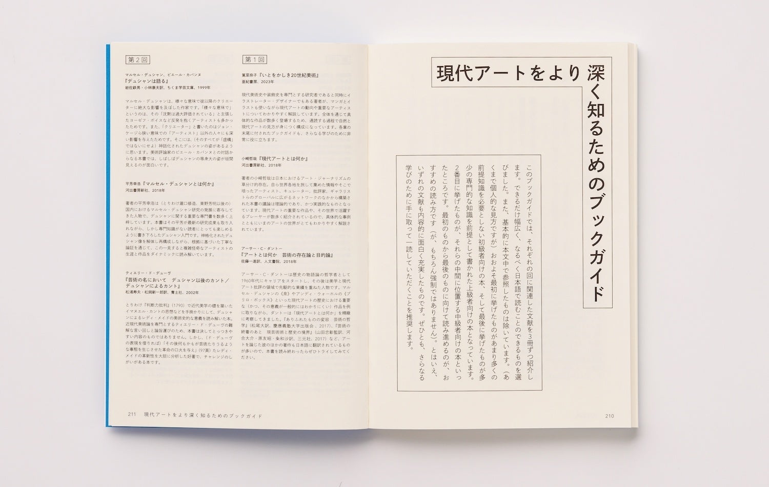 巻末には、12のテーマごとに3冊ずつ、合計36冊を紹介した充実のブックガイドが掲載されています。初級・中級・上級の3段階にわけて山本氏が厳選。丁寧な解説も付いています。興味をもったテーマをさらに深掘りしたい方、また、現代アートをもっと学びたい、知識を広げたい読者にとっては保存版ともいえる内容になっています。