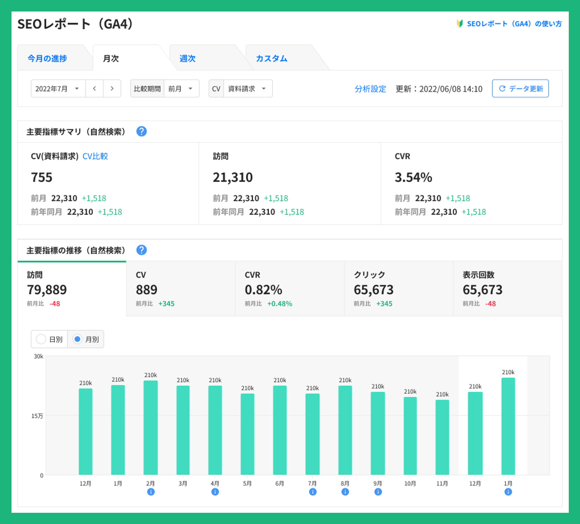 AIアナリストの「SEOレポート」は、自然検索に関するサイトの主要指標(訪問数/CV数/クリック数など)の推移と進捗を確認できるレポート機能です。