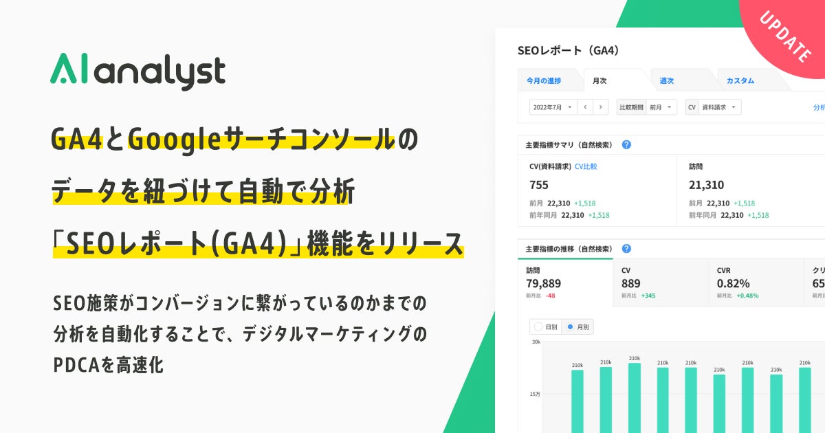 『AIアナリスト』にGoogleアナリティクス4(GA4)のデータとGoogleサーチコンソールのデータを自動紐づけして分析する「SEOレポート(GA4)」機能をリリース