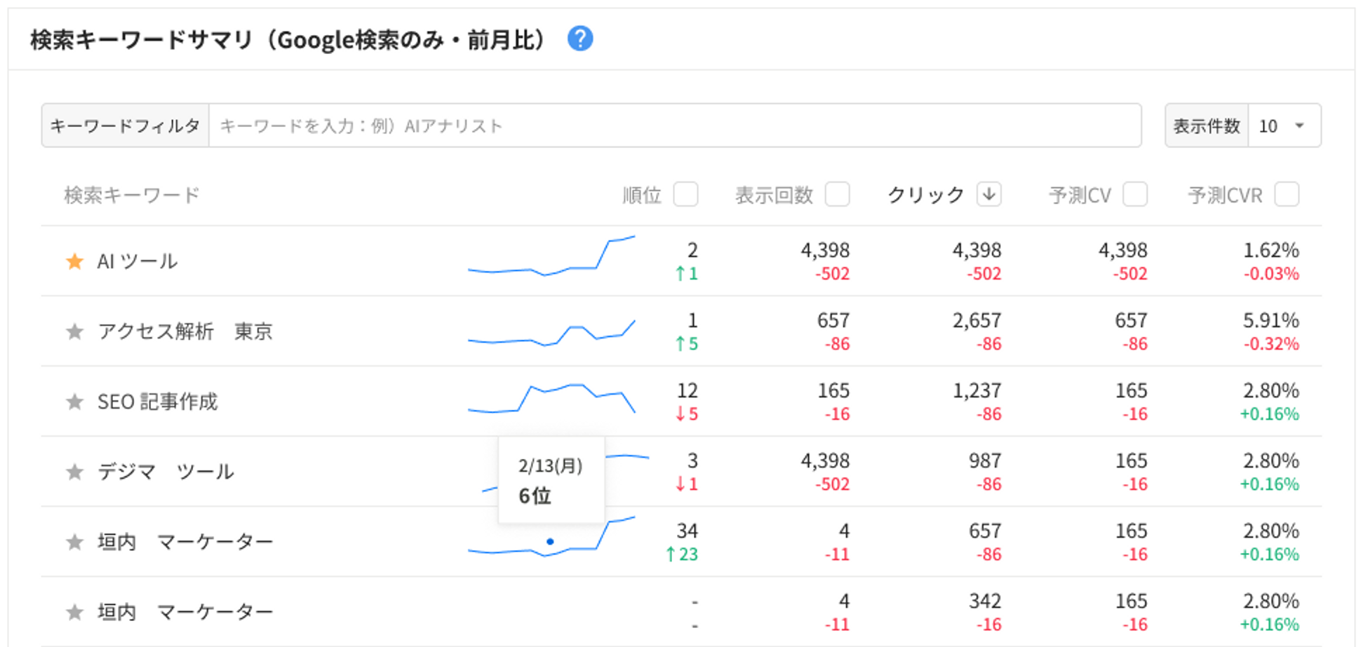クリック数の多いキーワードを確認できるパネルです。クリック数上位のキーワードについて、順位の推移・表示回数・クリック数と、クリック後(=サイト流入後)の予測CV/CVRを確認できます。キーワードの★マークにチェックを入れることで、次回以降の分析でも指定したキーワードのデータを確認することができます。