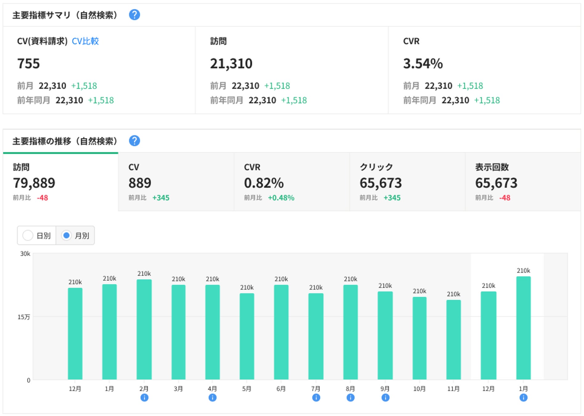 「主要指標の推移」パネルでは、自然検索流入での訪問・CV・CVRと、検索媒体上でのクリック数・表示回数について、グラフ形式で過去からの推移を確認できます。