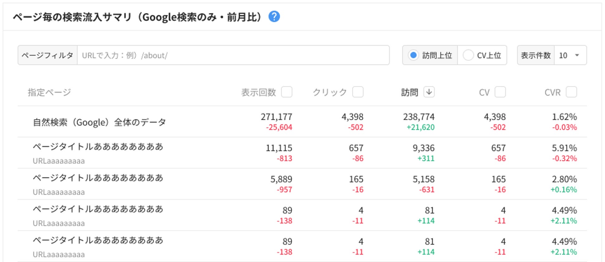 自然検索流入の多い「ページ」を確認することができるパネルです。自然検索からの訪問が多いページの訪問/CV/CVRを確認できます。それらのページについて、Google検索における表示回数・クリック数を確認できます。