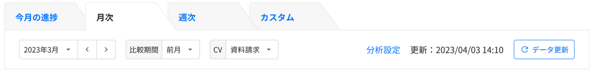 サイトレポートでは、「今月の進捗」「月次」「週次」「カスタム」の4種類の分析期間があり、ページ上部のタブで切り替えて表示できます。